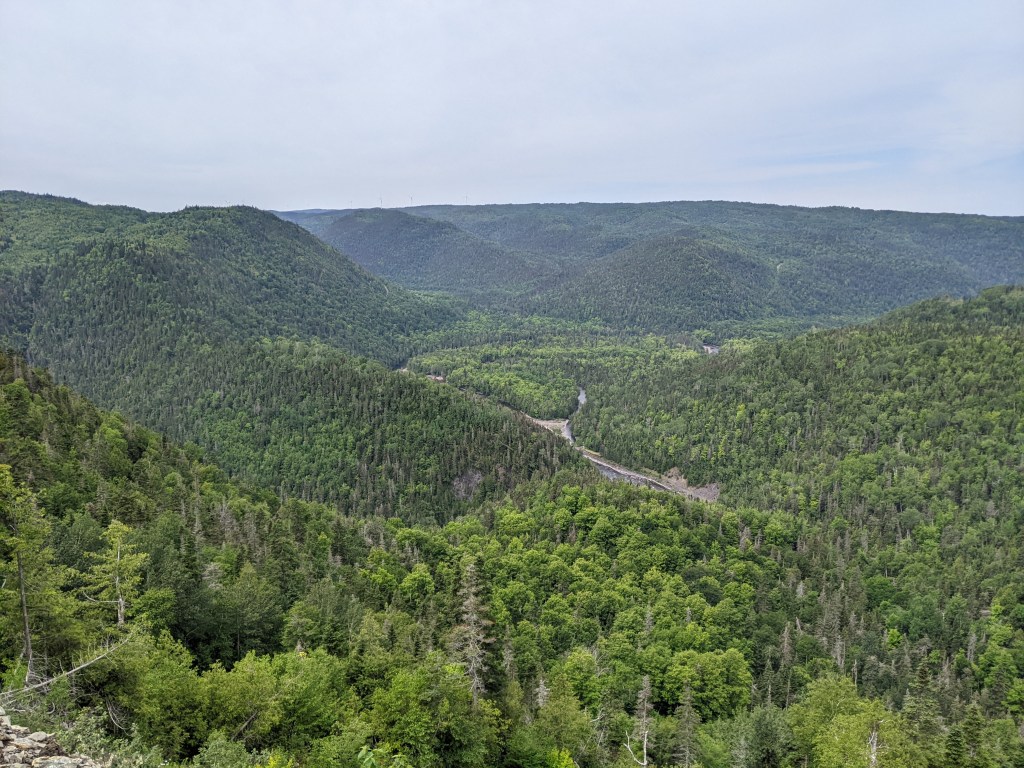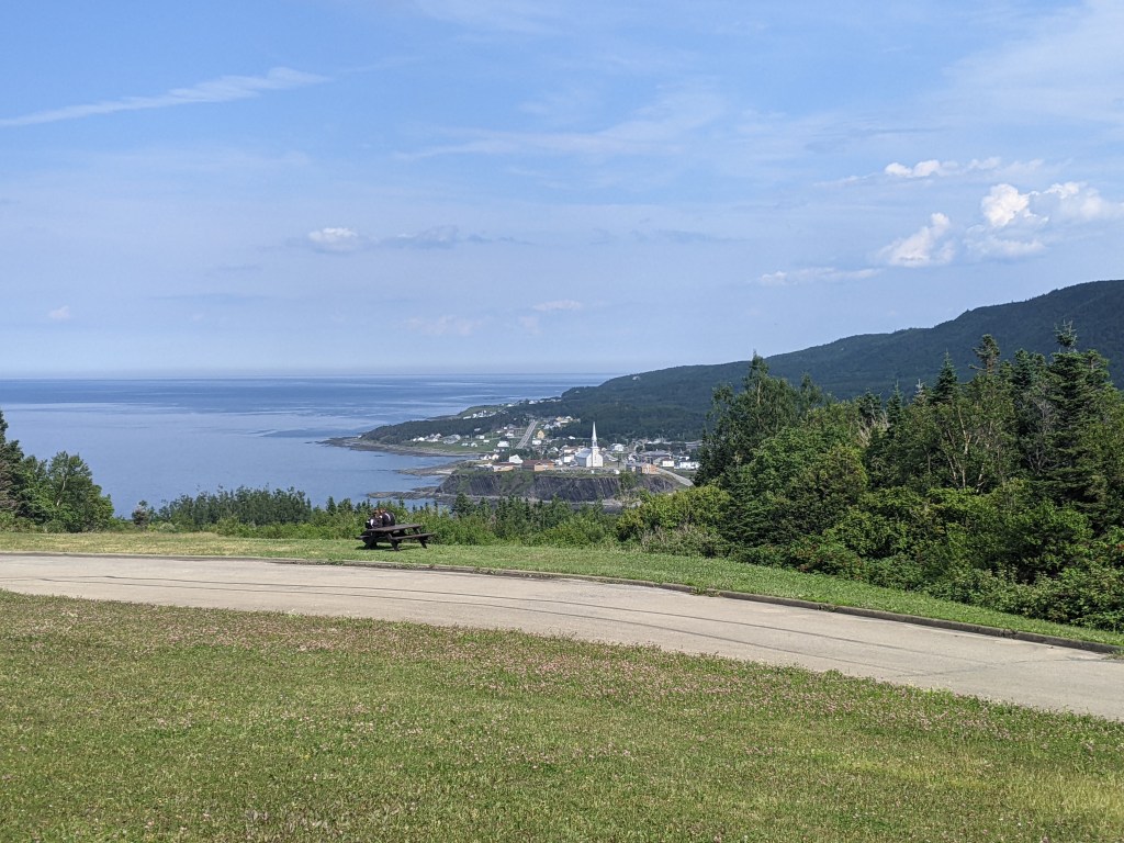 I woke up very early and couldn’t get back to sleep what with crows cawing and someone nearby snoring. I finally gave up trying at about 5:30 and since my clothes didn’t seem any dryer, I hung them up on a line, at least it was sunny. I didn’t leave the campground until around 8:30 as I was waiting for my clothes to dry. As I walked out of the village, I noticed a minivan pulled over on the side of the highway and the driver seemed to be rummaging around in the trunk. When I came up to the car, the man said hello and started asking me about my hike. He was from Saskatchewan and was driving to a family reunion in Nova Scotia and was an avid hiker as well. He then offered me a mango, yes please! As well as a few other food items from his trunk. I couldn’t take everything he offered but ended up with some dried figs as well. After he drove away, it hit me that it wasn’t by chance that he was stopped when I walked by, but that he had stopped on purpose to offer me something when he’d seen me walking along the highway! I was overcome with gratitude, but wished I had thanked him even more than I did. It was my birthday and I couldn’t think of a better way to start it off. The trail continued along the highway and through Rivière Madeline for about 3 km before turning down a dirt road and eventually up to a viewpoint back out to Rivière Madeleine.