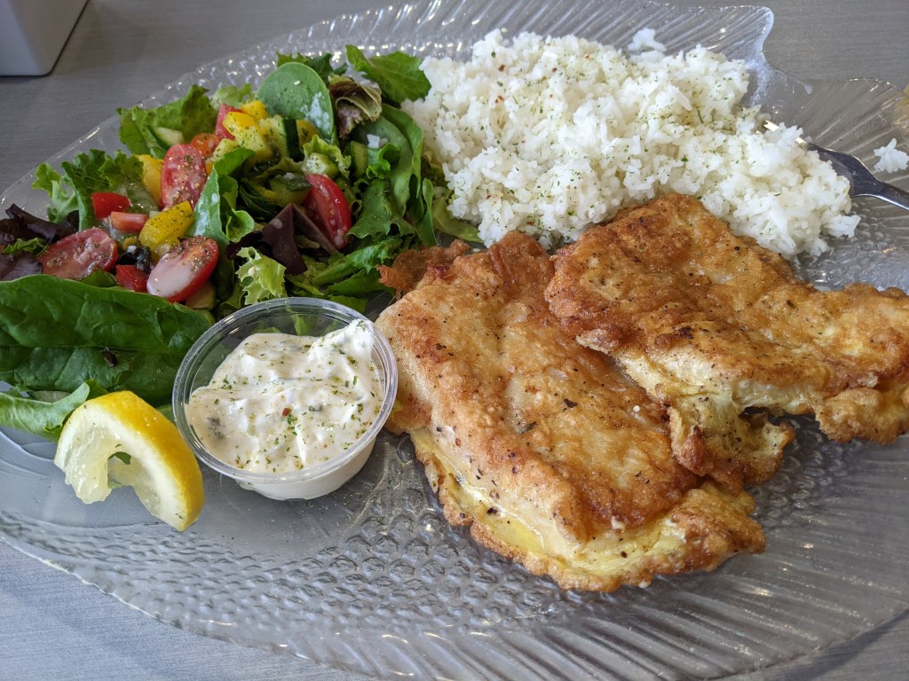 It was then on into the village where I tried to find some bug spray since mine was low, but wasn’t successful. It was on the motel for the night, I had treated myself to a real bed for the night, and was glad to find my last resupply box waiting for me. I called Mum and Dad, showered and washed out my clothes again, including my bra, not remembering that I needed one to wear out to dinner. Mum had sent me some money to pay for my dinner and the motel had a well-rated restaurant, so once I figured out that I could use my Buff as a tube bra, off I went. I had cod a la Gaspésienne, meaning it was very lightly coated in flour and egg and pan-fried, and a choux pastry ball thing for desert. The fish was fresh and good, but the choux pastry was very sweet and rich.