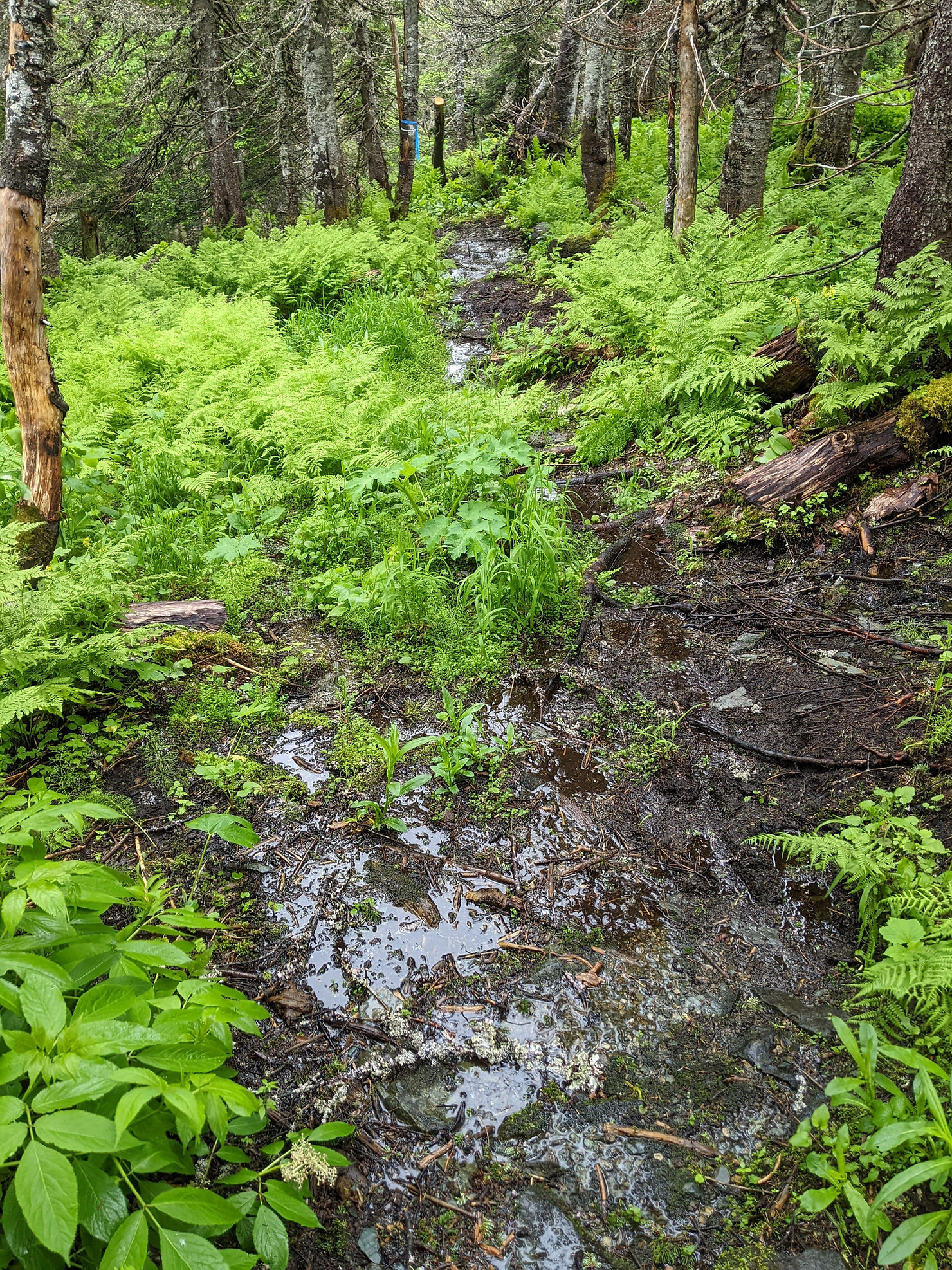 I didn’t sleep very well as I kept hearing noises as if someone was unwrapping food. I thought it might be Judith since she has diabetes, but in the morning, they told me it was a mouse that was trying to get into their food that they had left out. I found it a bit odd that they didn’t secure their food, but to each his own. I was up and away quite early and was glad to see it wasn’t raining although it was very misty and cloudy. The first part of the day was a climb back up to the trail and then up some more to the summit of Mont Blanc, which I believe is the highest peak in the Reserve. It was a complete white out at the top and windy.