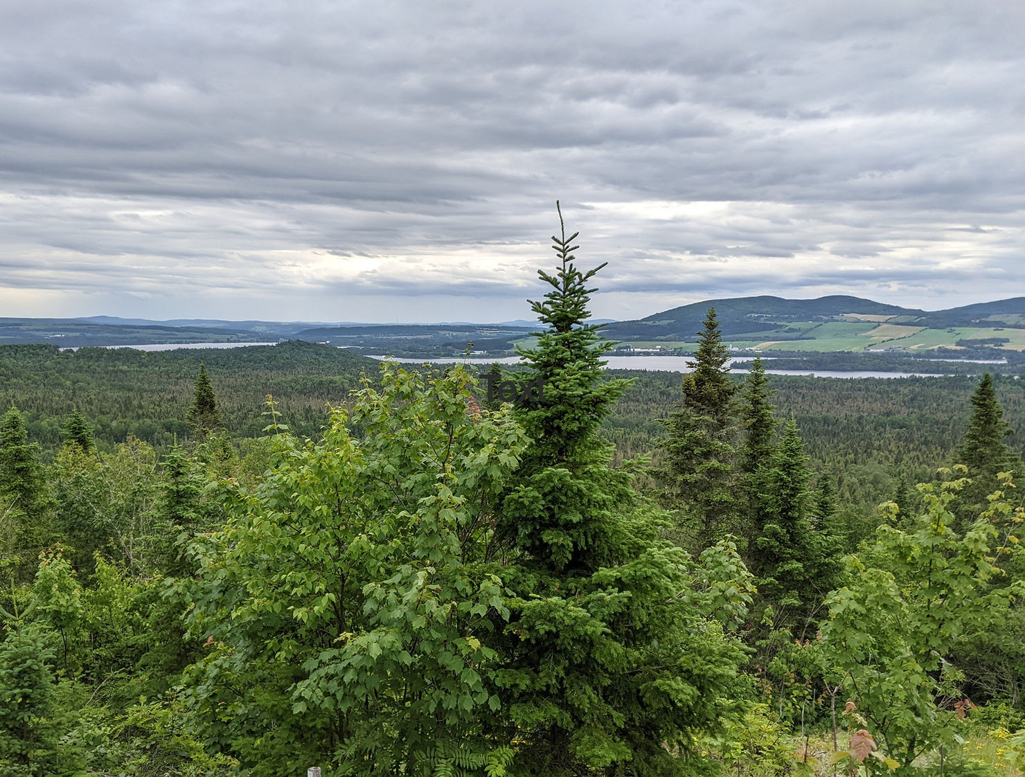 There were quite a few houses along the lake and as I passed by one of them, I was stopped by a man who was loading his car and who explained that he and his wife had just bought this house as a cottage and that they live St-Hyacinthe. They’re familiar with the SIA as they’ve been hiking it in sections over the last few years and are doing the section that I just finished in August. Continuing on, the road eventually turned into a combination of road and cross country ski trails. It started to rain a bit and I tried out my hiking umbrella again but ended up holding it in one hand and both of my hiking poles in the other, which was ok on road but probably not practical for a trail. Finally, there was a section of real hiking trail up to the abri Trois Soeurs. I had lunch at a look-out just before the shelter and it seemed like the weather was clearing up as the sun was starting to come out.