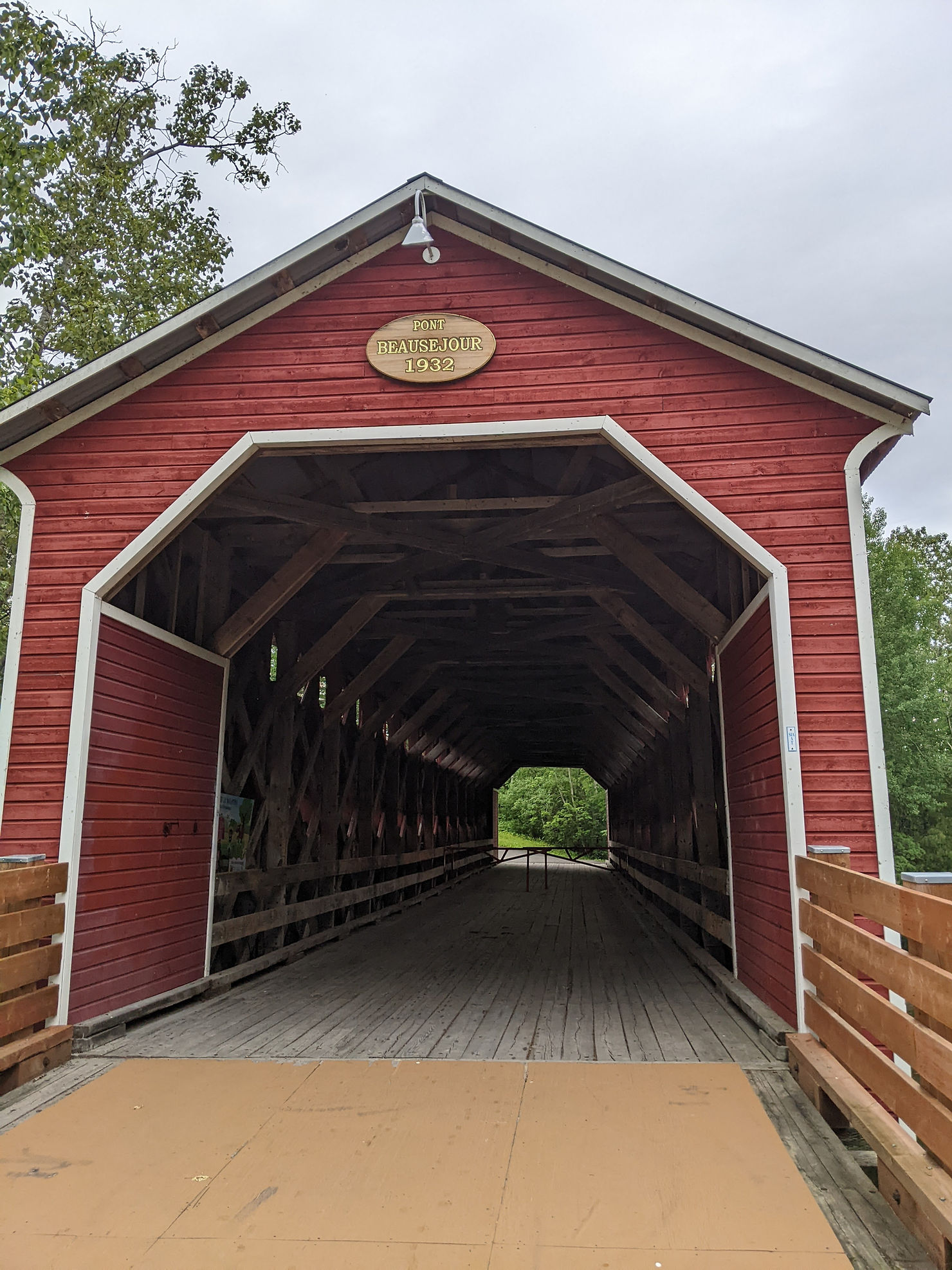 As planned, I started my day by going to the café. My debit card was declined again when I tried to use it to pay for my pastry and latte. So, I used my dwindling cash again feeling quite confused. I had seen on the news that there was an issue with Rogers and that a lot of things were disrupted as a consequence, but the café said that so far no one else had an issue with their card. Oh well, I figured that I didn’t need to buy anything again for over a week and that I’d deal with it then if needed. The first part of today’s route went over another covered bridge and then followed a paved road out of town with lac Matapedia on one side and farmland on the other.