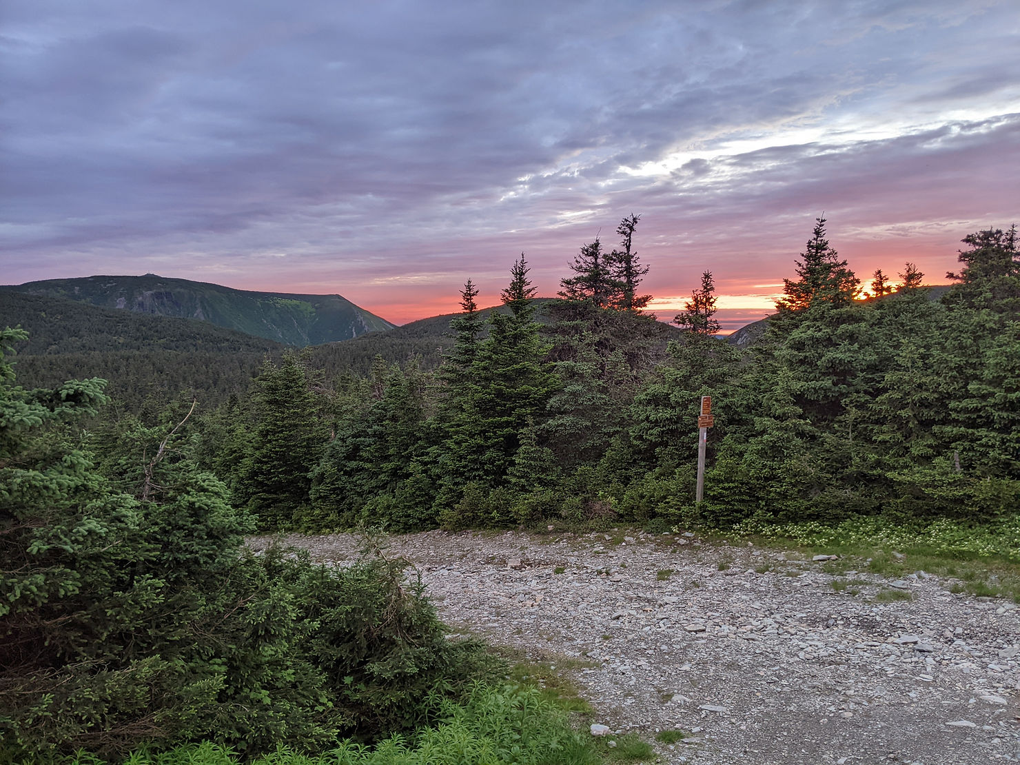 I saw some paw prints in the mud and hoped that there were some people hiking with a dog ahead of me. I did catch up with some day hikers at the waterfall, but they didn’t have a dog. One of them assured me that it was a coyote print, but that I needn’t worry since they’re typically solitary and stay away of humans. Apparently, it’s very rare to see one and their howls can make it sound like there’s a whole pack when it’s just a solitary one. The hikers gave me a sandwich and an apple, my second trail magic. I gladly accepted them even though my pack was full of my resupply. The trail continues to Abri Ruisseau Bascon, where I had camped two years ago and then it’s a very long gradual climb up the back of Mont Matawees. After Ruisseau Bascon, there’s no water until near the refuge, about 18km away, so I drank as much as I could, filled up all my bottles and my 2L pouch. Ouff, my bag was heavy, the heaviest yet what with 8 lbs of water and my food resupply. And even though I was glad to have a clear day, it certainly made for very warm climbing. I did finally get to the top of Matawees and had a lunch break while enjoying the epic views of the Chic Chocs and the St-Lawrence Gulf.
