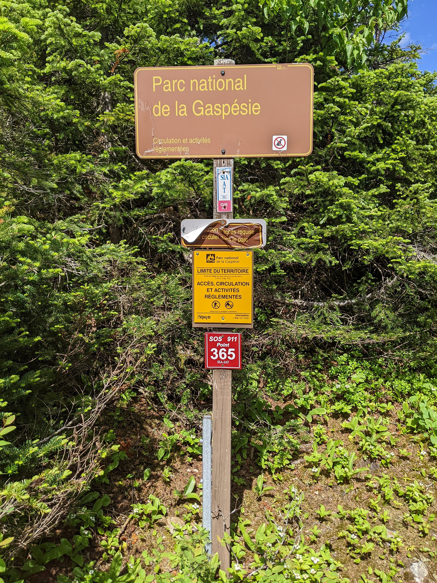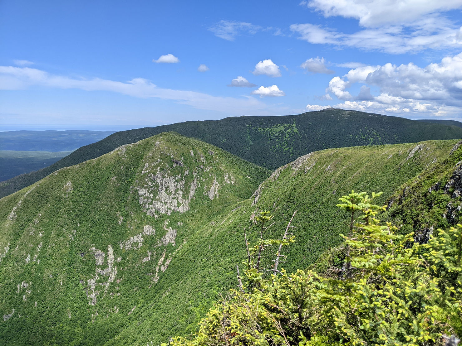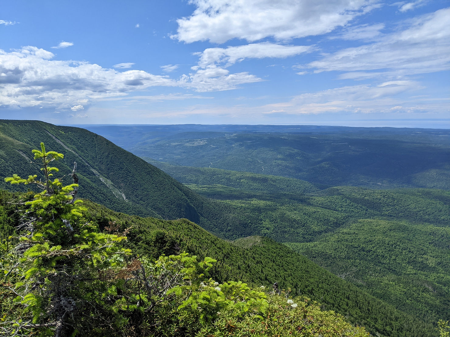 After lunch, it was along a ridge, across some scree, down and then up again to another longer ridge and finally up to the top of Mont Logan, at 1150m. At some point, I had crossed into the next section of the trail; the Parc de la Gaspesie.