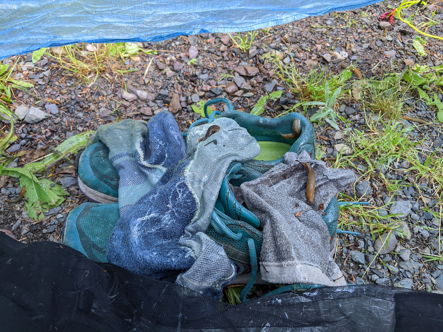 I didn’t sleep very well, one of my blistered toes was on fire and it was stormy. Since I had a short day, I decided to get up late and take my time before leaving so my tent could dry. Everything I left in the vestibule, like my shoes and socks, and my tent, including the inner mesh were covered in slugs and slug slime.