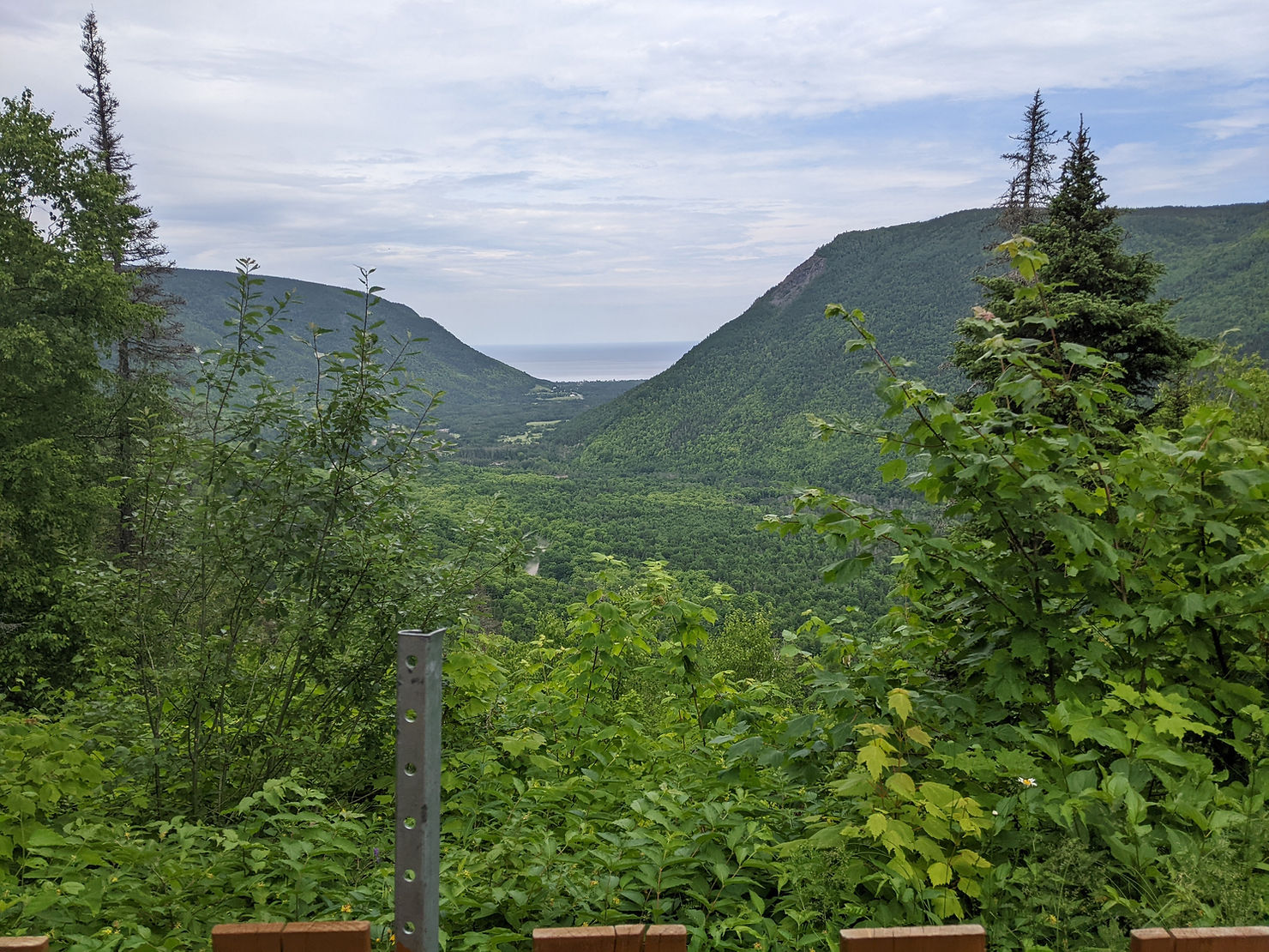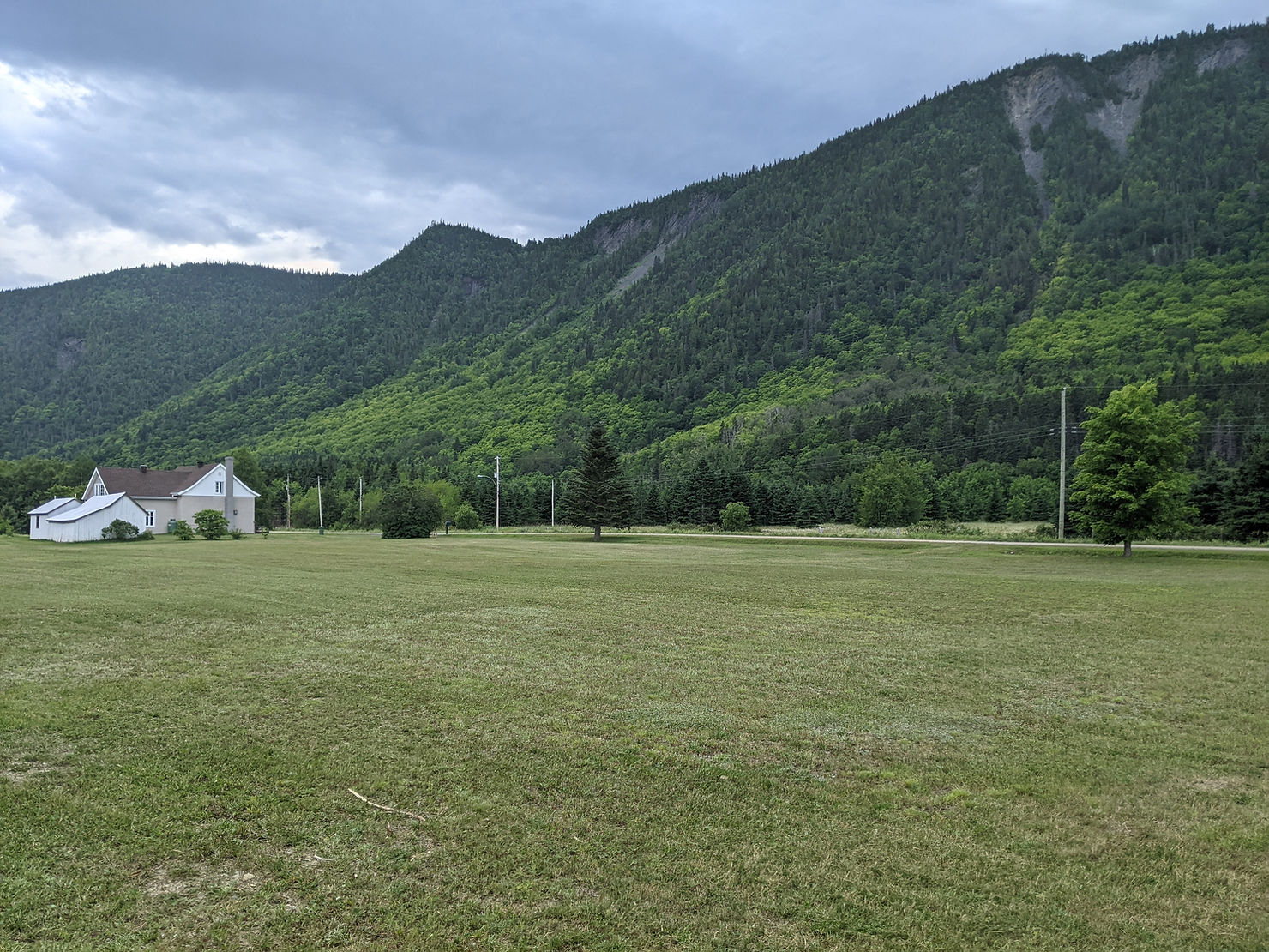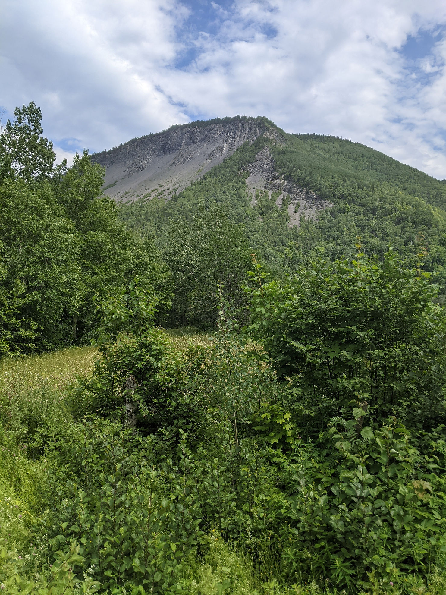 I slept much better than the previous night and was up at about 7am. As I was packing up, I realised that I was missing my rock/rope bag for my bear hang and figured I had left where I had hung my food. I went to look for it and as I got back, I was surprised to see a woman sitting at the picnic table outside the refuge. It turned out that she’s running the trail! She only had a tiny day pack for trail running and was doing the endeavor supported and with a friend, who had decided to take the day off today. She was off again in a moment. I was pretty slow today, my feet and Achilles were sore and even one of my quads. I stopped for lunch about 10km in, just by side of the forestry road. About 2km later, I came to a covered picnic table with a view to the bay of Mt-St-Pierre, which would have been an ideal spot, but which wasn’t indicated on any of my maps. I stopped again anyways since it was a lovely spot and even profited from the roof as a shower passed over.