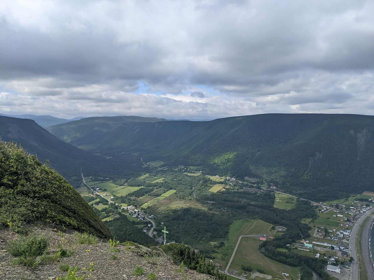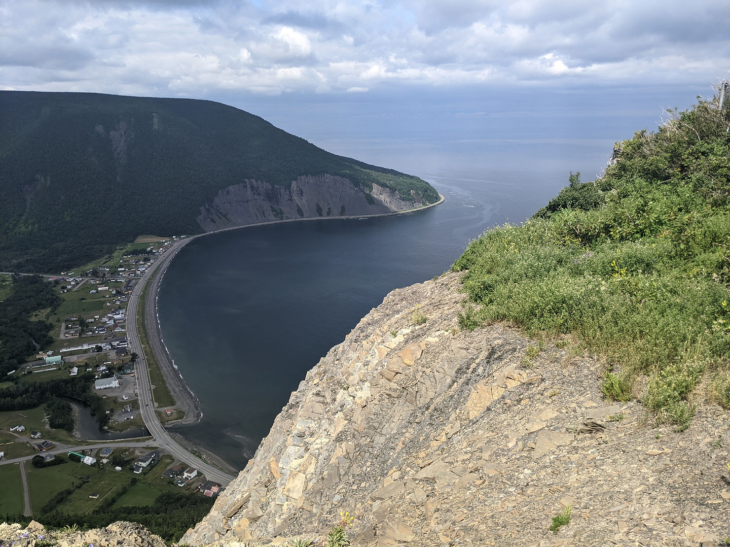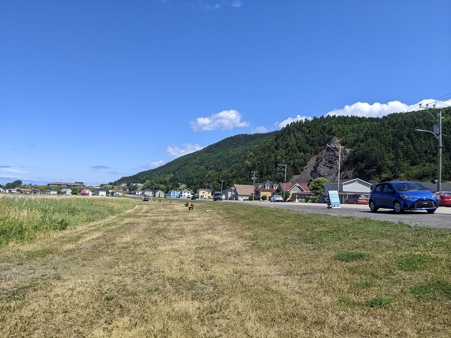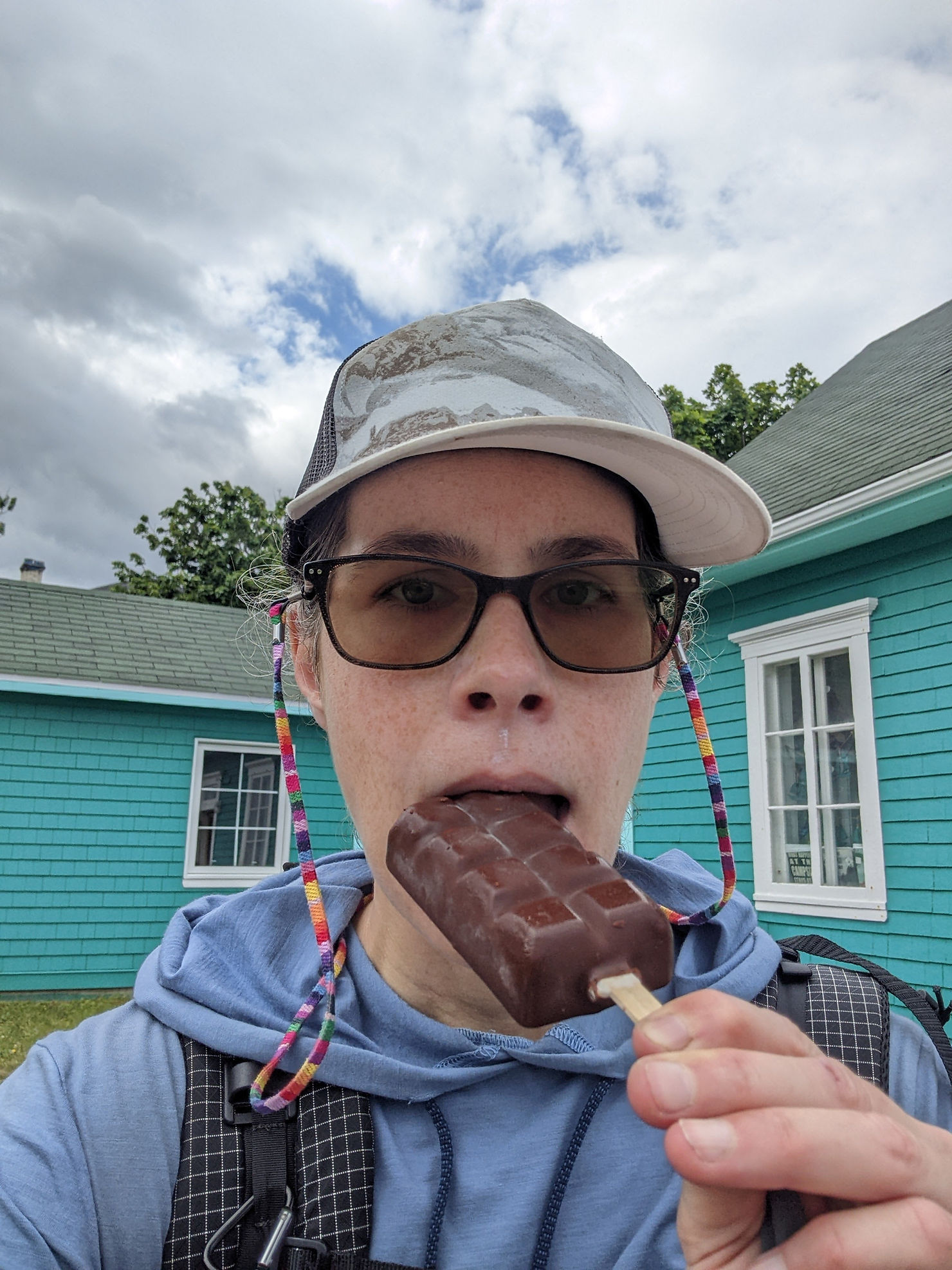 In the morning I found out that there had been tornadoes in Matane, about 200km away and I felt extremely grateful that the storms had been so light where I was. I walked the first few kms into the town of Mt-St-Pierre, which is spread along a bay. I had finally made it to the coast of the Gulf. I went to the grocery store to get some gas for my stove. I wasn’t completely out, but I wasn’t sure I’d be able to find more since the trail notes don’t mention any other shop that sells it after this one. As I was heading back through the village, I noticed a giftshop/ice cream shop and since it was open, I went to have a look even though it was just 9 am. Their specialty were ice cream bars on sticks, sort of like Magnums. I got a dark chocolate raspberry one, which was nice even if the raspberry flavor was subtle.