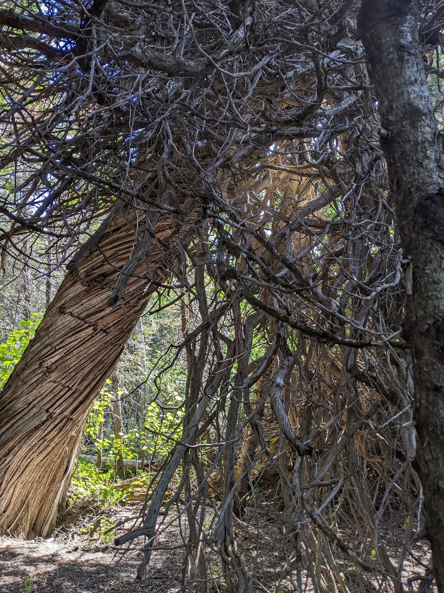 Just out of town, the trail turns up a dirt road that parallels the coastal highway. There were some ripe raspberries along the side, which were delicious despite being dusty. The road joined up with the highway in Anse Pleureuse, which doesn’t have any services. From there, the trail went inland and up a steep dirt road. On the way up, an 85-year old man in a pick-up truck stopped to chat. He told me his whole life story, including his recent cancer diagnosis. I found it a bit uncanny that he guessed my age right on the nose although it would only be correct for one more day. The trail turned into a real path again once the climb was finished, which came to a view point over Anse Pleureuse below. It was very windy there and my hat even blew off, so I didn’t stay long. There were also some cool pine trees that seemed to be twisted and to have crazy roots and branches all over the place.