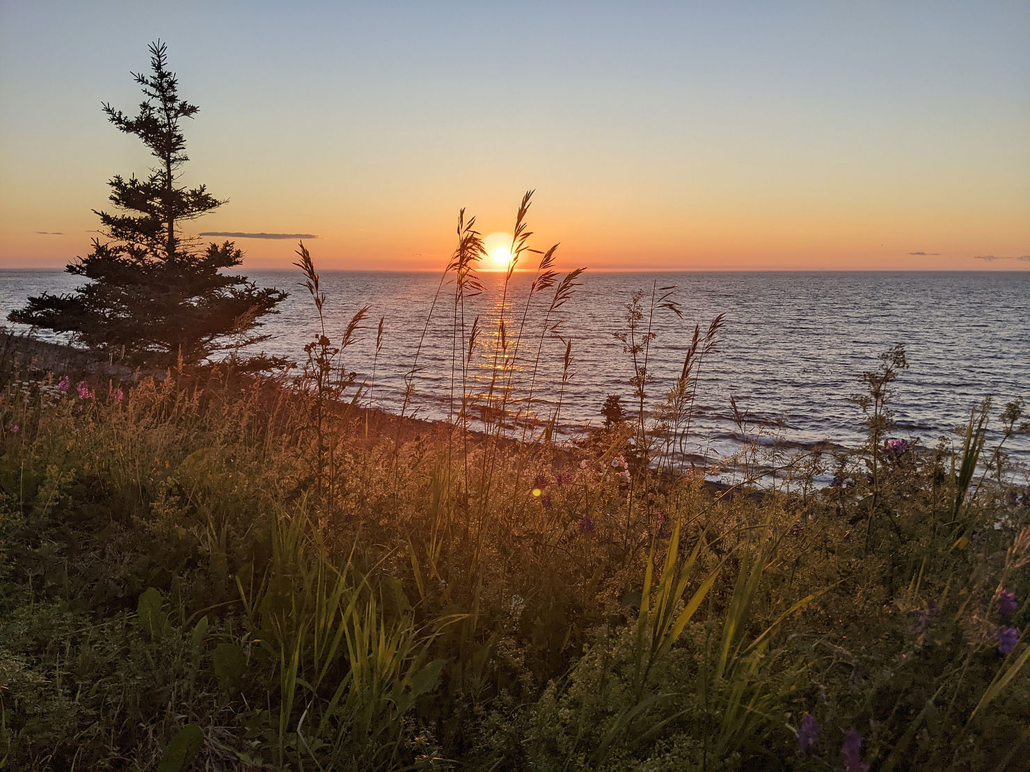 The trail eventually headed down again towards the coast to the abri, which has a view of the coast and a picnic table a short walk away with an even better view of the coast. There were a few houses nearby and the 132 wasn’t far (could hear it at the picnic table). I made my pasta and salmon dinner and enjoyed it at the table, watching the sun set over the Gulf. I even saw some gannets plunging as I ate. It was a magical spot and I went to bed feeling very much at peace.