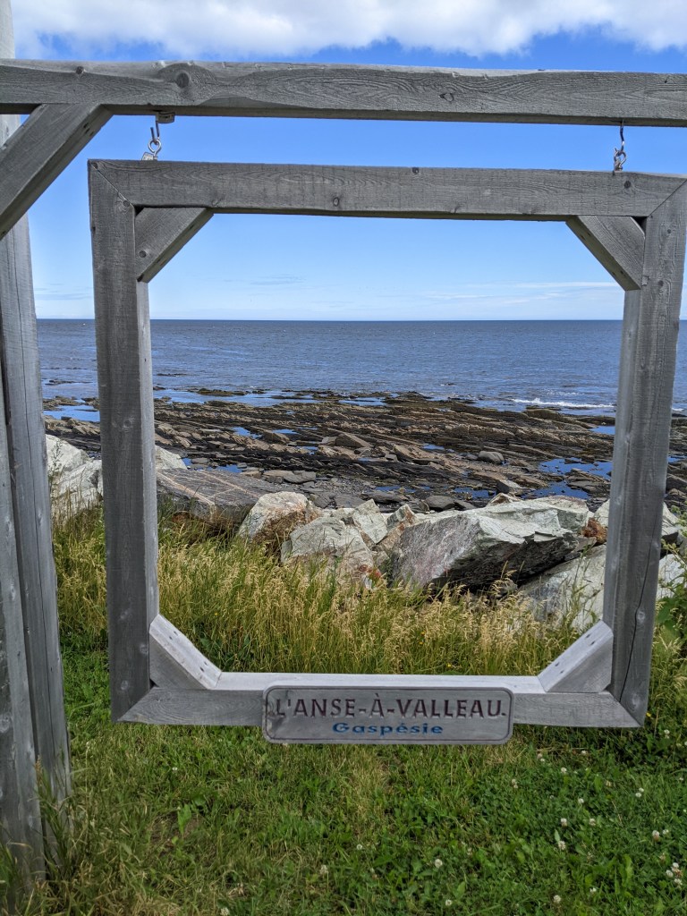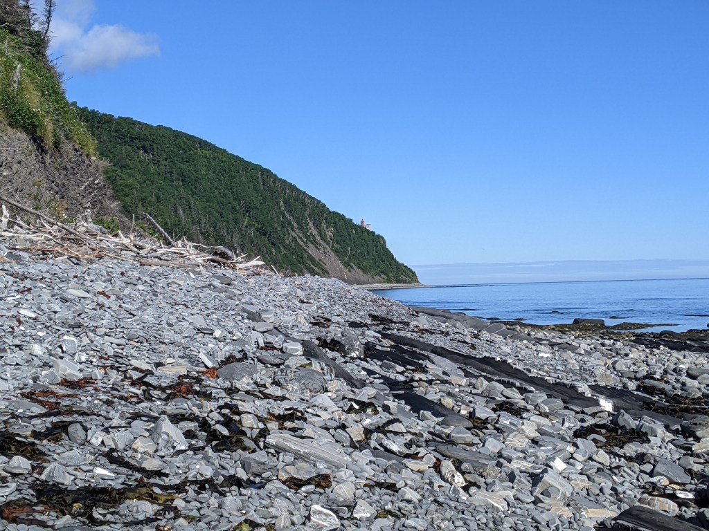 The trail leaves the shoreline at Anse à Valleau, where we headed up a hill to Camping des Ancêtres, where the guys had a food box waiting and I was hoping to purchase bug spray.