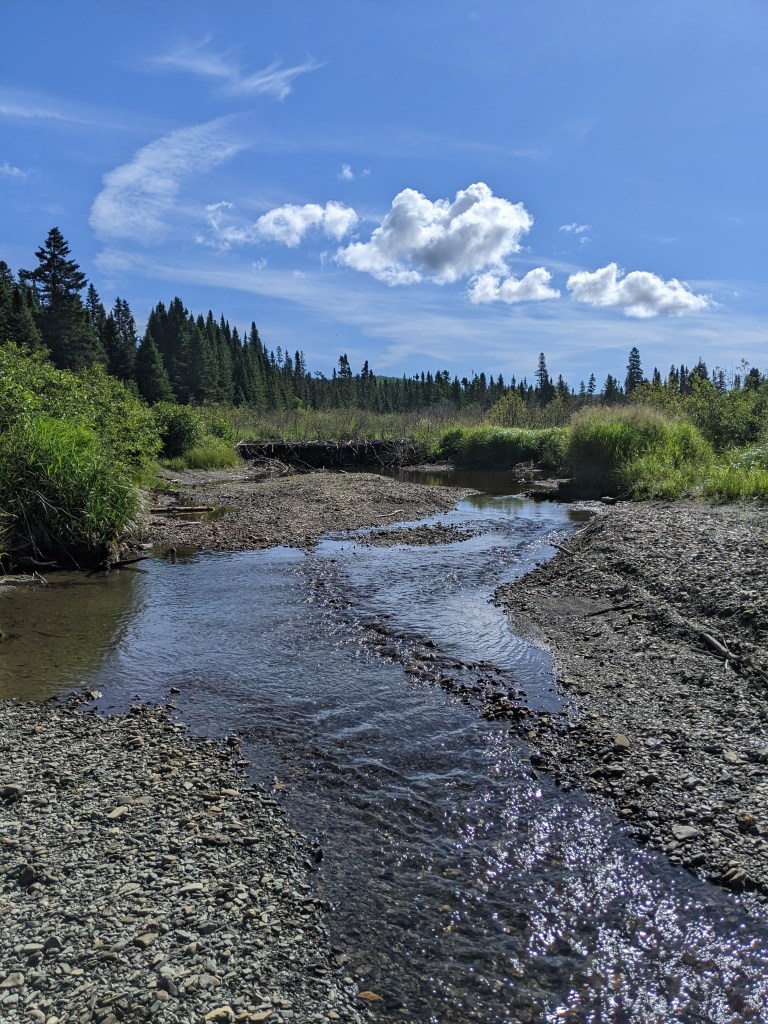 They were out, but the woman went and got hers from her car and I ended up buying it from her for $5. After dowsing myself, it was back into the woods away from the coast along a real trail all the way to our lunch spot at the abri Carrière. There’s a quarry nearby, hence the name and we could hear the activity. There was also a construction crew at the abri, retro fitting the shelter with a patio door, the same crew that I had met at Les Caburons. I was a bit alarmed that we would have to sit outside to eat since I’d thought that we’d be inside the abri and away from the bugs, but the bug spray seemed to be doing it’s job. The rest of the day was up and down, but nothing as bad as the previous days. We stopped at a river for a break before knocking out the final few kms to the Refuge l’Erablière.
