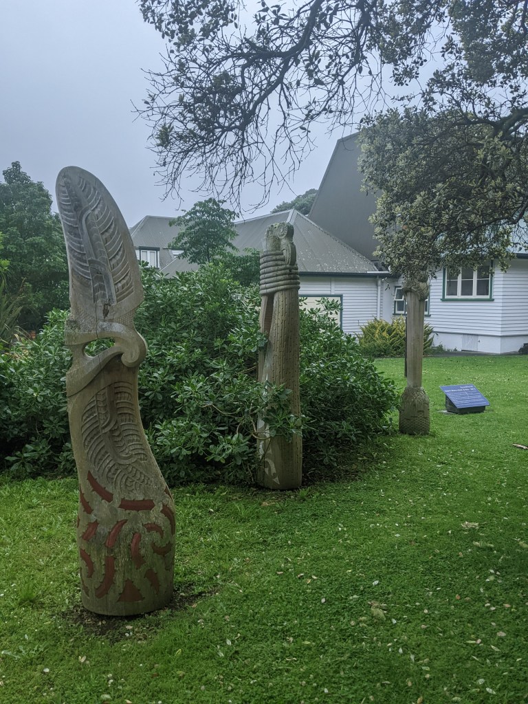 Maori carvings near the museum that each symbolize different things of a Maori’s leader’s life