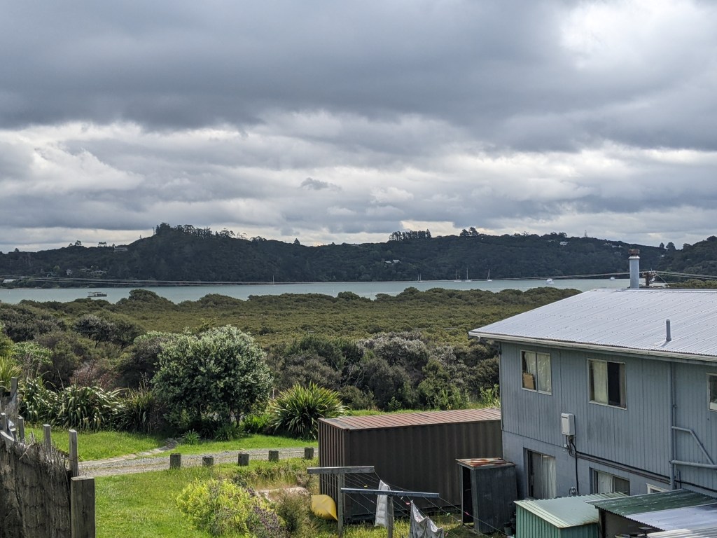 After a nice pizza lunch, I had about 4 kms of road walking to get to the Orongo Bay Holiday Park. I had booked a room and was given an upgrade to one with a private bathroom, a kitchenette and a view of the Bay.