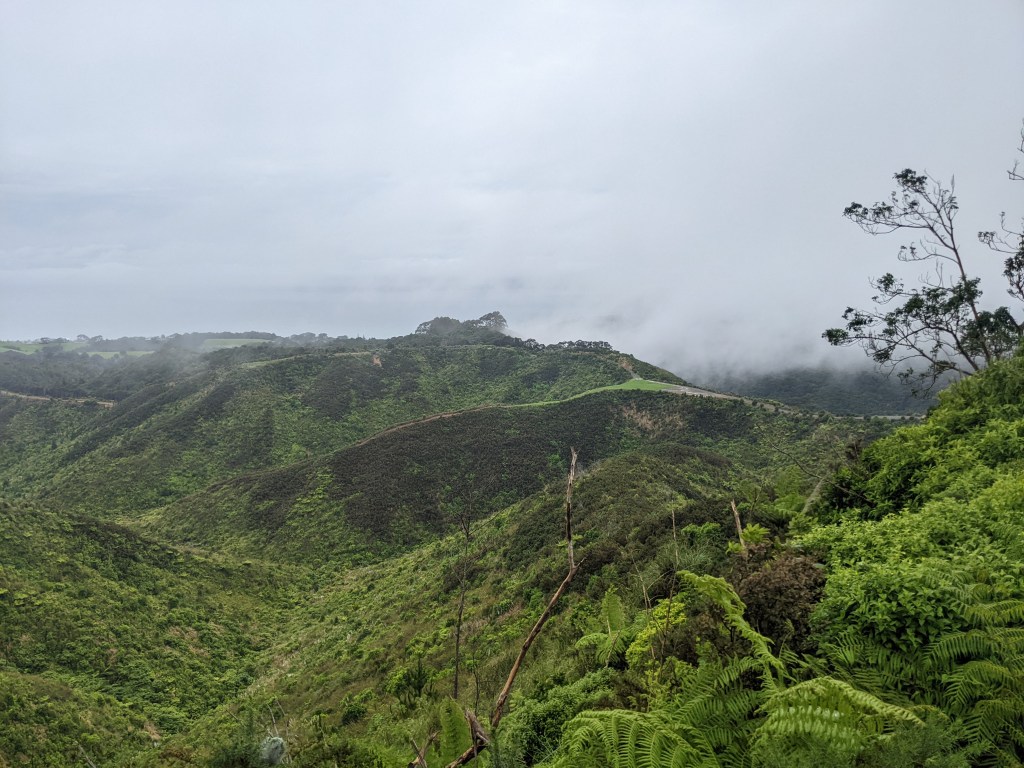 The Langsview track started at the end of the gravel road and it was a muddy, slippery mess as per usual. It started to rain again and the wind started to get up. I didn’t stop at the top given that the conditions were so inhospitable. Thankfully the track turned into a gravel road again just after the summit and it was much easier going. After a short stint down a paved road, it was onto another gravel road through a large farm. I stopped in a sheltered spot the other side of a gate to have lunch. Although the rain had stopped again, it was getting even more windy.