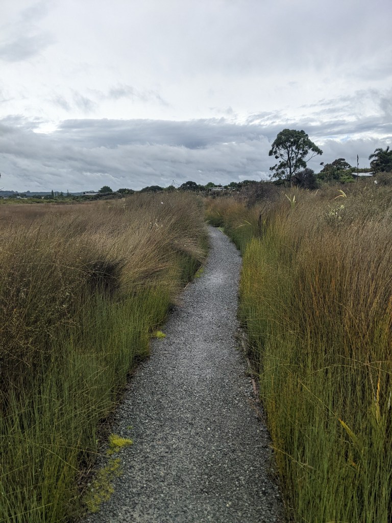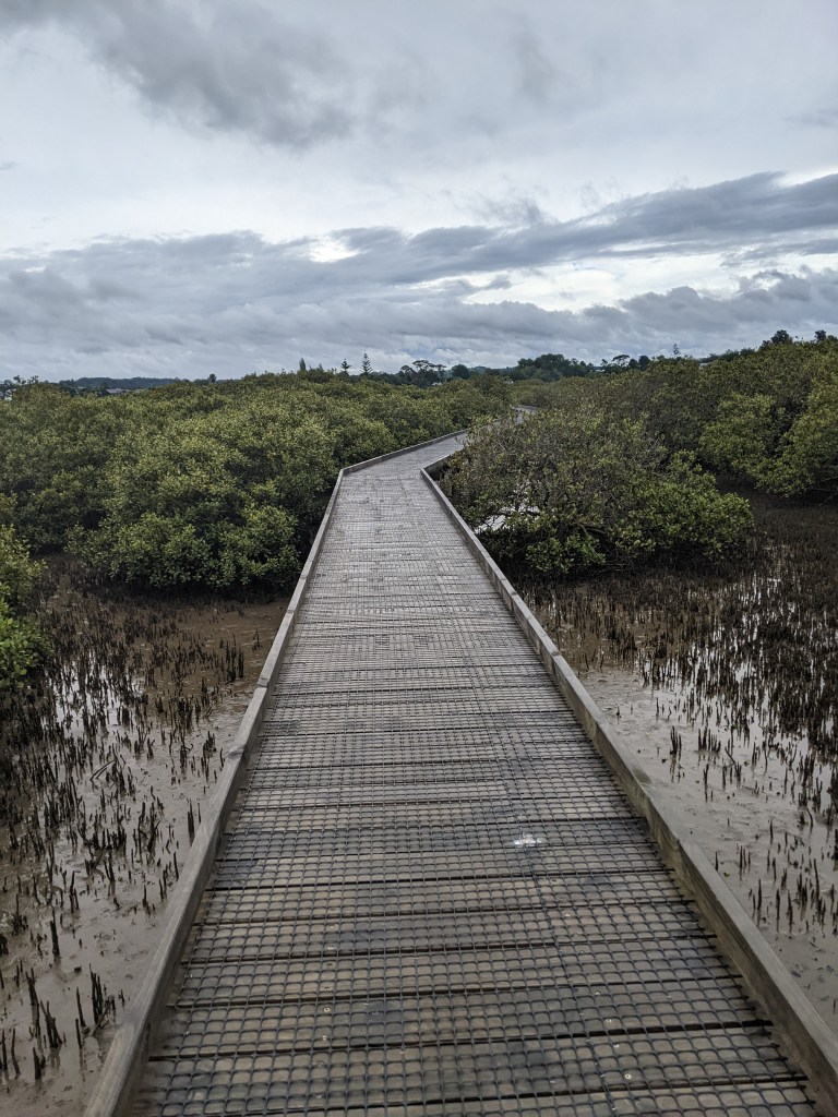 The walkway ended at the beach and went about a km along the beach before turning up a road that went around an estuary and into Mangawhai. I stopped for a snack at a cafe (ginger bar thing and a decaf flat white). as I left the cafe, it started the thunder and a few minutes later it started to pour. I took refuge in a real estate office with a covered porch (with their permission) and continued on when it eased about a half hour later. After crossing a bridge, there was a walkway along the estuary and a boardwalk through some mangroves before arriving in Mangawhai Village, my destination for the night.