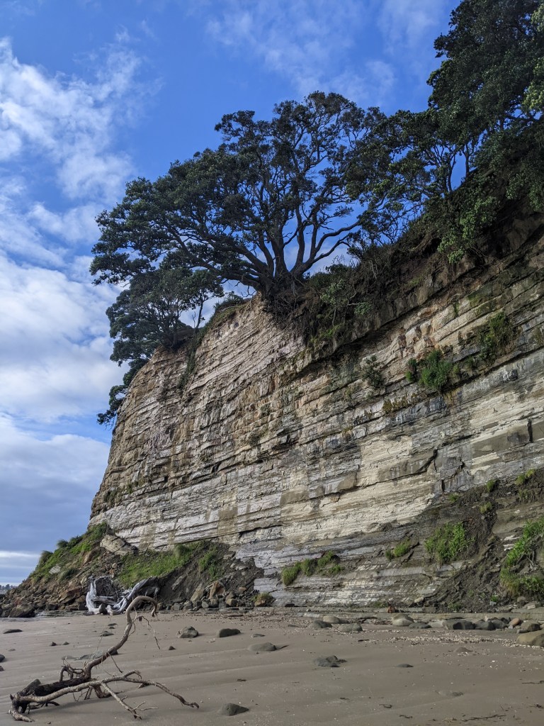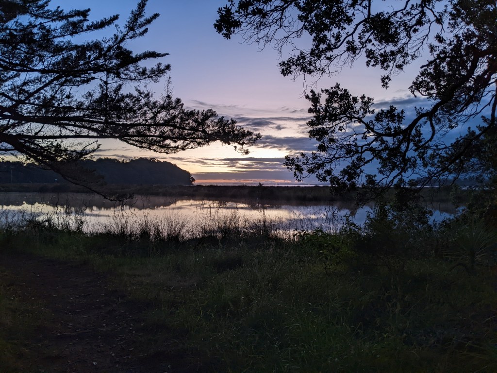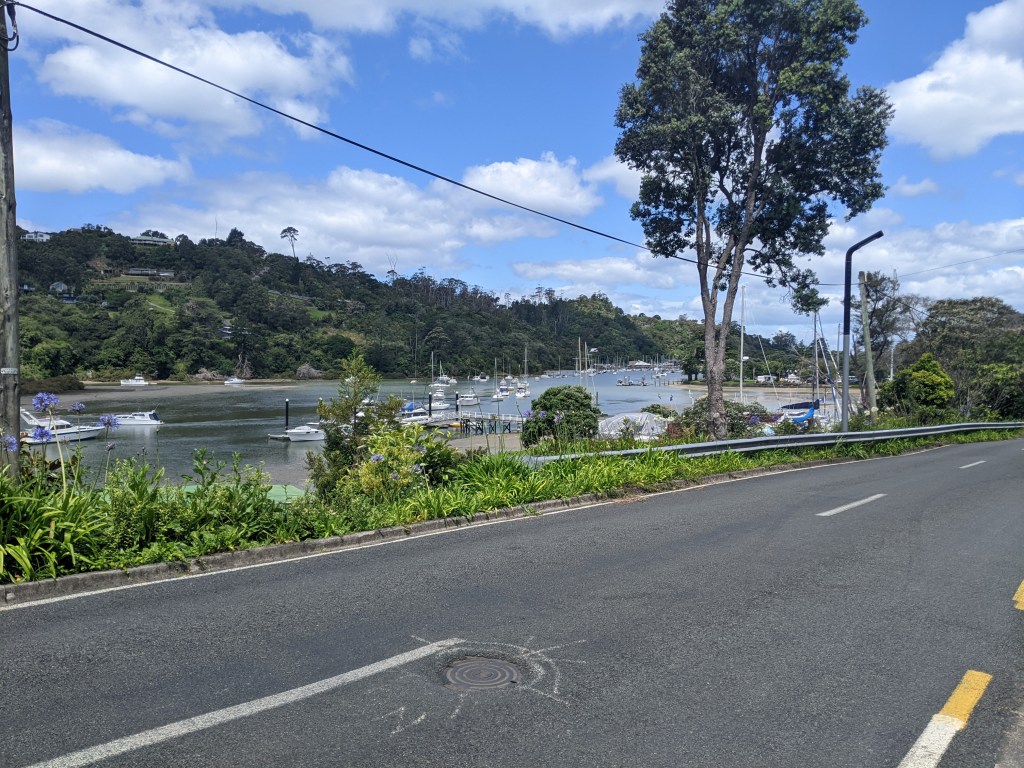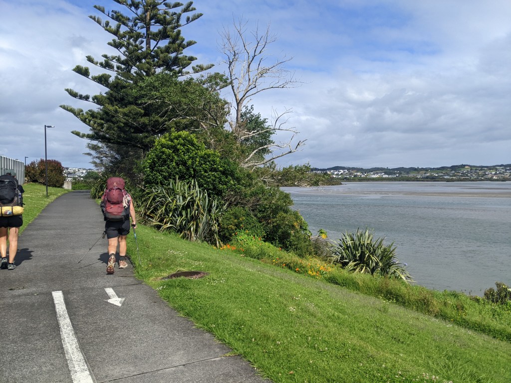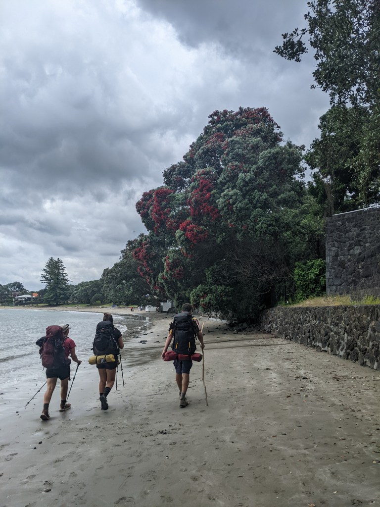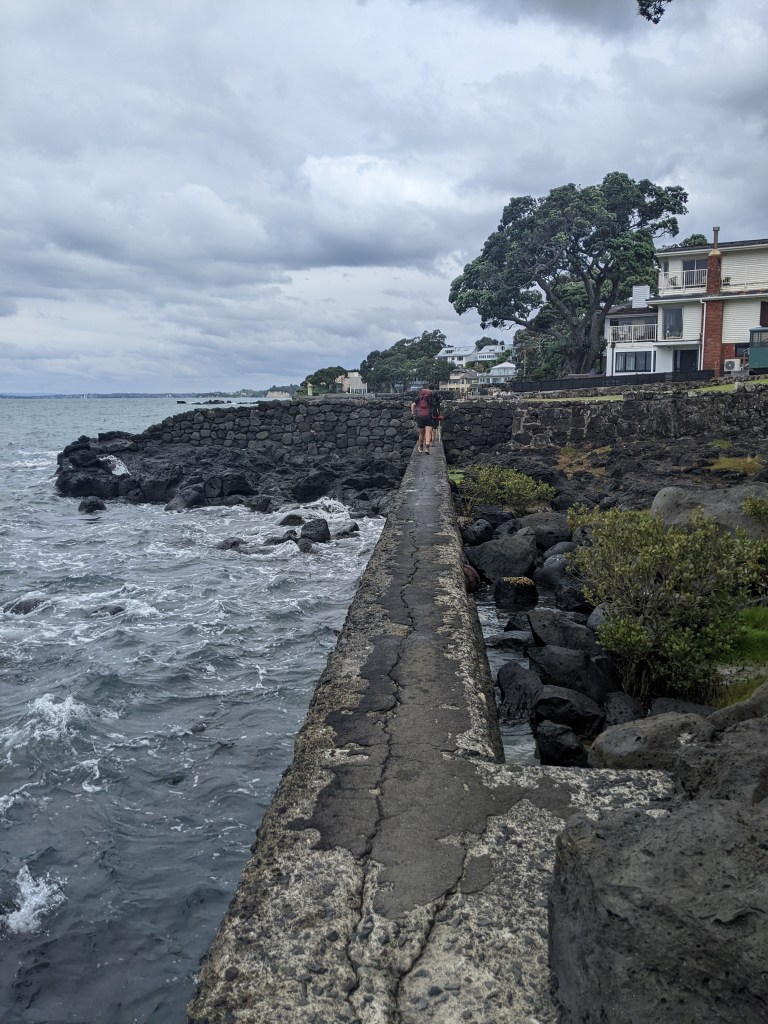 When we got near Torbay, we detoured into town to a cafe to have a warm drink. Afterwards, the trail followed the coast from one North Auckland suburb to the next. We met a lot of people out for walks and got stopped a few times to be asked what we’re doing and even if we were training for something. One couple we met, Melinda and Ian, invited us over to their house for some tea. We accepted and were led up a small hill to their house with a beautiful view out to the sea. They had done a fair bit of travelling and backpacking themselves when younger and pay forward the generosity that they received on their travels. They made us a beautiful platter of avocado, lettuce, tomato, hummus, egg and cheese with bread for lunch and of course some tea. It was a lovely experience, especially given it was unexpected. After an hour or so, we continued on and met Tyson, an Australian doing the trail who always turns up when you’re least expecting to see him. We hadn’t seen him for almost a week and there he was taking a break on a bench in a park. We continued on together for a while, getting our feet a bit wet again since the tide was high now and lapping up to the top of the beach or the rocks that we had to negotiate.