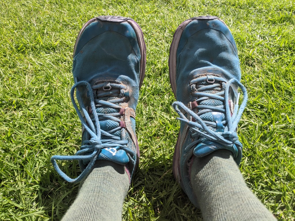 I hadn’t set an alarm since I’m a light sleeper and did wake at about 4:20 when others started stirring. We set off just after 5 am and within less than a minute my shoes were soaked from the dew on the grassy track and then the puddles and mud.