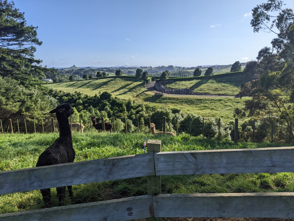 The rain started as I arrived at my destination, a hobby farm with alpacas, sheep, ducks, chickens and four little dogs. It’s the retirement project of Kerryl (away for the night) and Tom (our host). He made us very welcome with some produce from their garden and even a bit of steak since he had too much (his friend cancelled on him for dinner), which Maureen and I had as an appetizer for our dinners. I also sampled some of his homemade gin and limoncello. He seems to be an anti-vaccer and conspiracy theorist and doesn’t have anything good to say about Justin Trudeau or their own PM, but I’m grateful that he’s sharing his little paradisiacal corner of New Zealand and admire his goal of being self-sufficient.