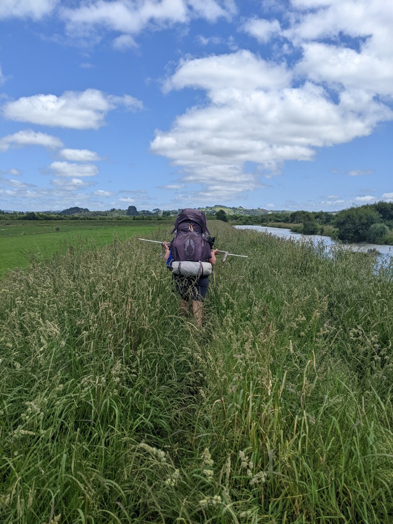 The end of the walkway was through a nice little forest and then some fields. After a few kms on a dirt road, we reached the SH2, which the official trail follows for 5.7 km before turning down a track along the Mangatawhiri river, using a bridge to cross the river. Since the shoulder of the SH2 is practically non-existent in places and it’s a major highway, a lot of people cut through a farm to the Mangatawhiri river, which has to be crossed on foot to get to the trail. Maureen and I opted for the latter and turned off the SH2 as soon as we could and used a dirt road to get to some fields, which we crossed to the river. It was a bit strange to hop fences without permission, but apparently the farmer encourages people to cross his land. The river was no small affair and we knew that we would likely have to swim so we blew up our air mattresses and put our packs on them and started across. It was a wade at first but there was a section that had to be swim and that was full of plants, making it harder to move forward. I was grateful that there was no real current and that I wasn’t on my own for this adventure.