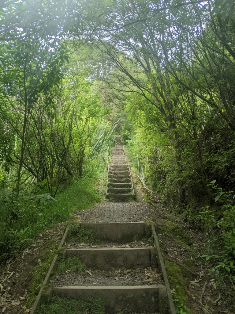The locals use this part of the walkway a lot for exercise and I saw a few of them out despite it being a Monday. The trail then turns into a tramping track (aka rooty, rocky, steep and muddy), which We follow for about 8-9 km.