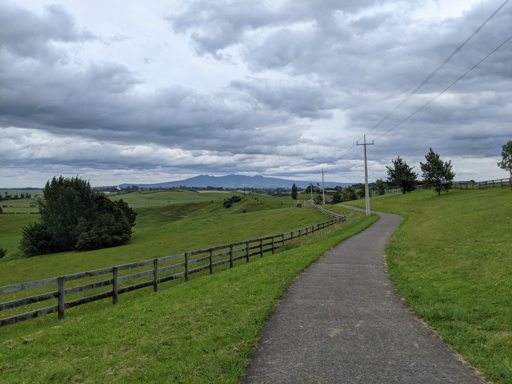 It was then along some road, a bike path and then more road for 6km to Dinsdale where I stopped for lunch and then went to a Bin Inn to get food for the next few days. I also went to the grocery store next door for cookies and crackers. My bag was even more uncomfortable after adding all the food. Shortly after leaving Dinsdale, the trail turned off onto a park that had a nice view of the next mountain we tackle, Mt Pirongia.