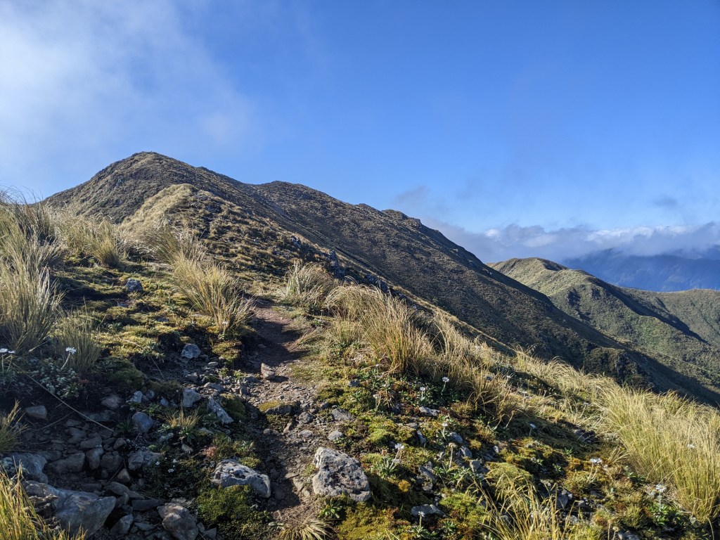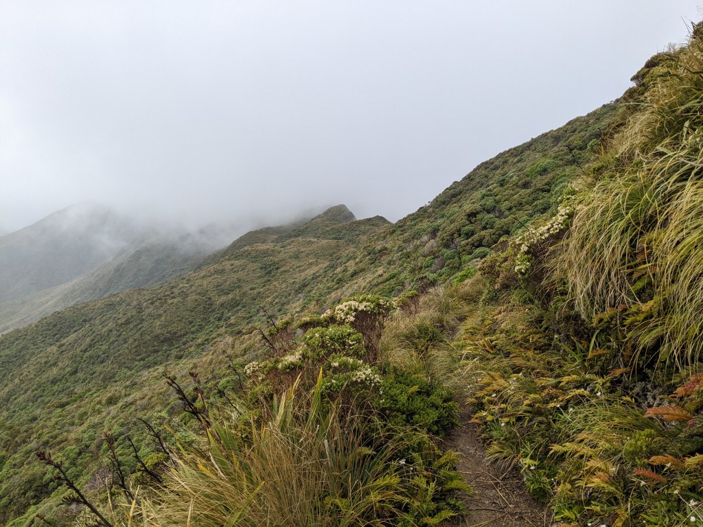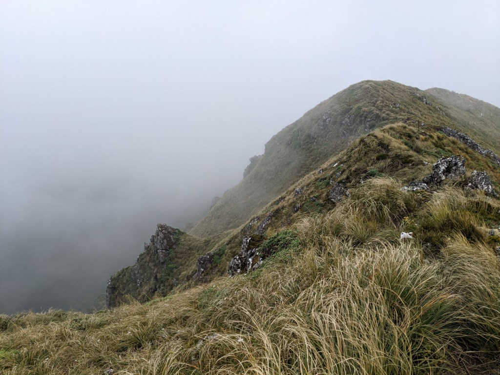 However, the main difficulty was that the grasses have grown over the trail and hide it so you have no idea what you’re going to step on, if anything (I stepped into an empty space where the trail was eroded at one point). They’re also are easy to trip over and can be slippy. One section of trail was also overgrown with some shrubs that I had to fight through while going up a slippery steep climb. Then there was the section with the a lot of scrambling next to steep drop offs.