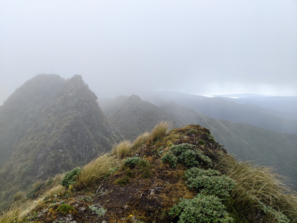 People started moving just before 6 so I joined the general getting up and got going just after 7. While all the others were heading towards Maungahuka, I was headed back to the TA at Junction Knob. It was overcast but seemed to be clearing so I was hopeful some views. The climb up to Junction Knob took about an hour and then it was in towards Mt Crawford, which is one of the highest peaks in the Tararuas at over 1500m. It was clearing when I got to the summit, but there was still some cloud hanging around.