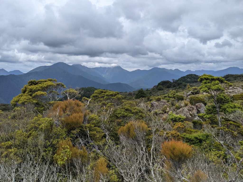 I was at Middy hut in a jif since the trail wasn’t difficult and took a short break before continuing on to Rocks hut. This was a bit slower going since after crossing the Pelorus one last time, the trail headed up. It was about 700m up to Rocks hut and I was quite sweaty by the time I got there since there wasn’t much of a breeze. It was only 11:30 so I had an early lunch then went up to the look out behind the hut and got my first real idea of the Richmonds.