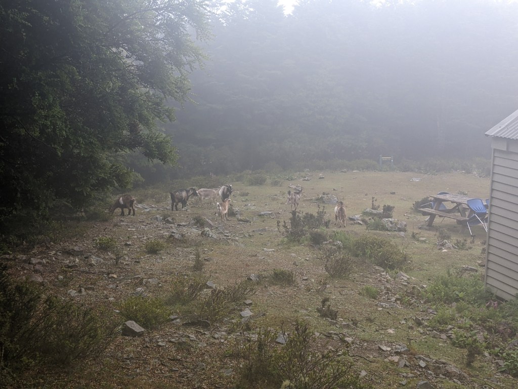 There was a bit of down and then up again past another summit before descending and sidling through the forest for a while. There was heavier rain in the afternoon so I was glad to reach Tarn hut, which is beside a small lake. I did manage to get a fire going this time and Hanna and then Emmet showed up so it looks like it will be the three of us again tonight. The hut sleeps five but there isn’t a lot of place to hang stuff so it’s nice to spread out our wet stuff. The rain continued all evening as well…