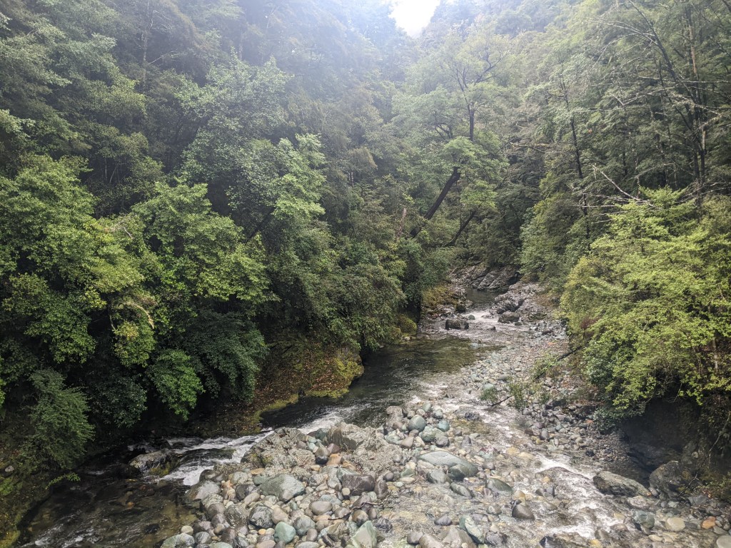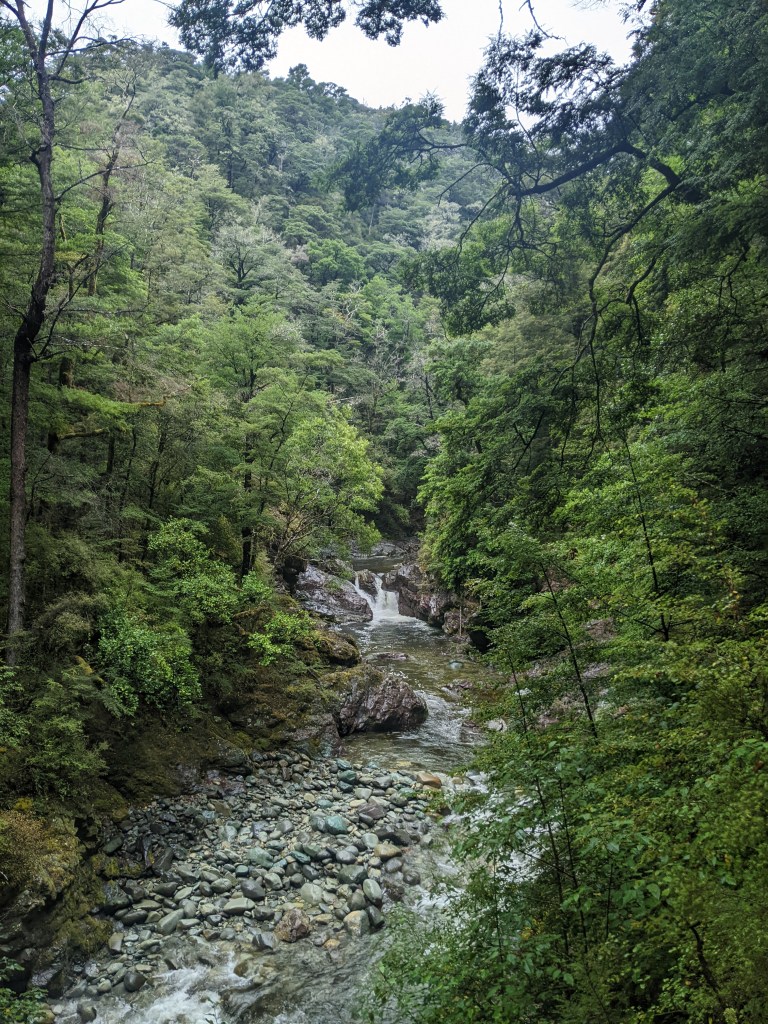 When I got to the hut, I took off my rain coat and my hiking shirt was drenched, not from rain but from my sweat given it was humid and warmer at lower elevation. I was even able to wring it out. Yuck. After an early lunch, it was along and through the river, climbing gradually. The trail was slippery, bouldery and eroded in places and slow going. There were lots of colours despite the gray sky; bright red rocks in the river and all sorts of shades of green in the forest.