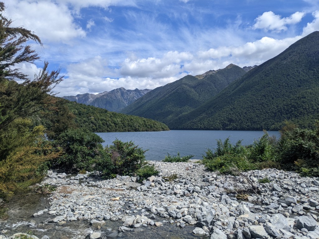 I took it easy in the morning, made some brekkie, called home and then finished my paperback before finally heading off by about noon. I had about 10 km to do along the shore of Lake Rotoiti to the first hut. The trail was fairly easy and the views of the lake with the surrounding mountains was enchanting.