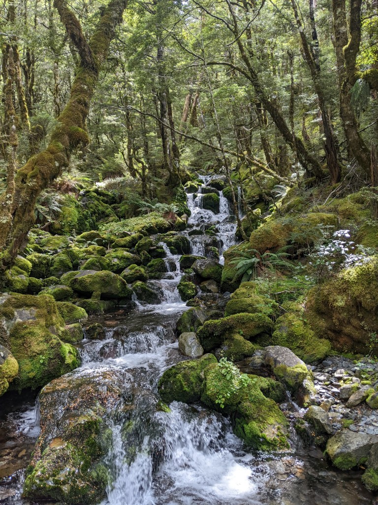 The general feeling seemed to be to not rush to get up this morning. Given that we were about 15 in the hut, I was surprised that no one was up and off before 6 and that most started stirring at 7:30-8. The sky was overcast, but it wasn’t windy or raining so it seems that the general feeling was also that it was best to go to the next hut. It was a nice walk that took just over two hours along a stream through the forest. There was even a side trail to a waterfall that would have been the perfect place to swim in a hot day.