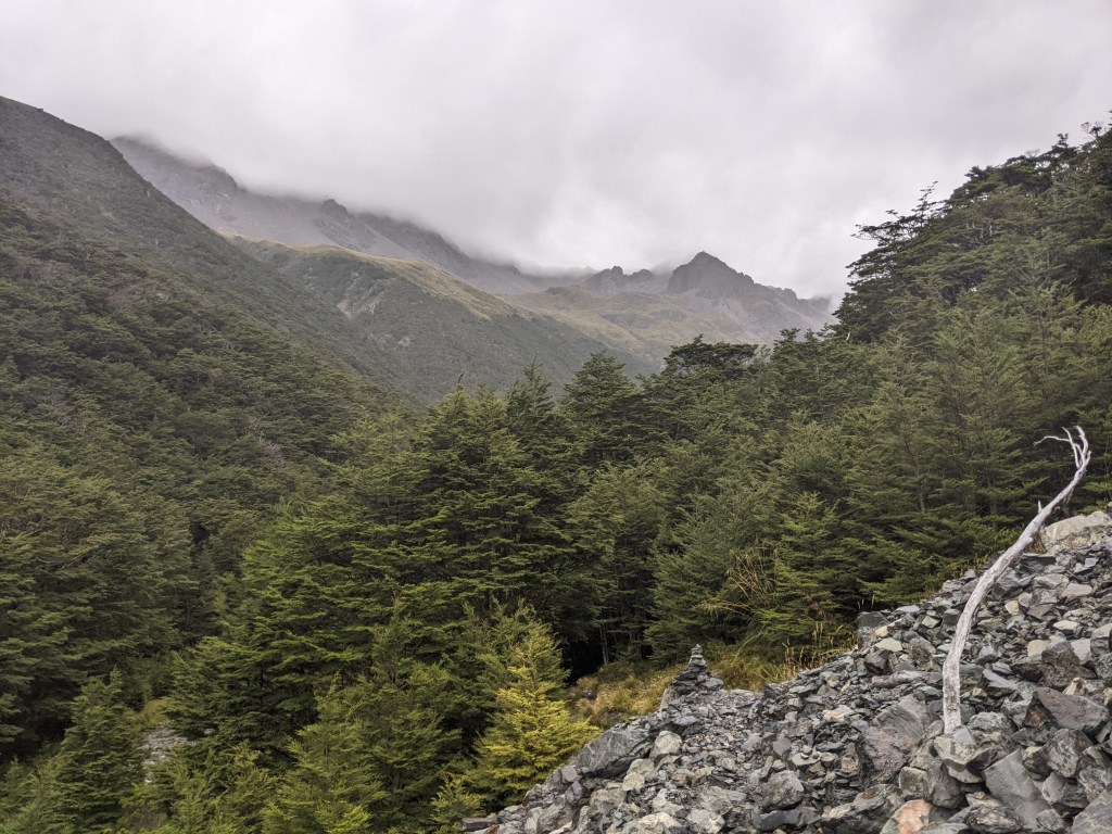 Closer to the hut, it was obvious that the wind was picking up and there were a few drops of rain. My decision was made not to go any further as I figured that the wind at the saddle (next section goes over Travers saddle at 1700m) might be close to 100km per hour. So it was an afternoon of eating and chatting at the hut. One woman, part of a group of hikers from Australia, arrived with a likely broken wrist and we used a Garmin InReach to contact emergency services. She seems comfortable enough thankfully. It’s definitely an advantage of the InReach to be able to actually message the situation and text back and forth. The helicopter showed up at around 6pm and the two search and rescuers came up to the hut and took the woman away. It was a bit unexpected since we thought they would tell us when they would head over as the last we’d heard was that they couldn’t offer an ETA given the weather. After that excitent, it was dinner and then an early bedtime.
