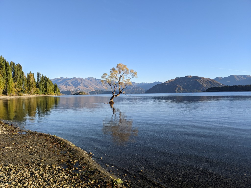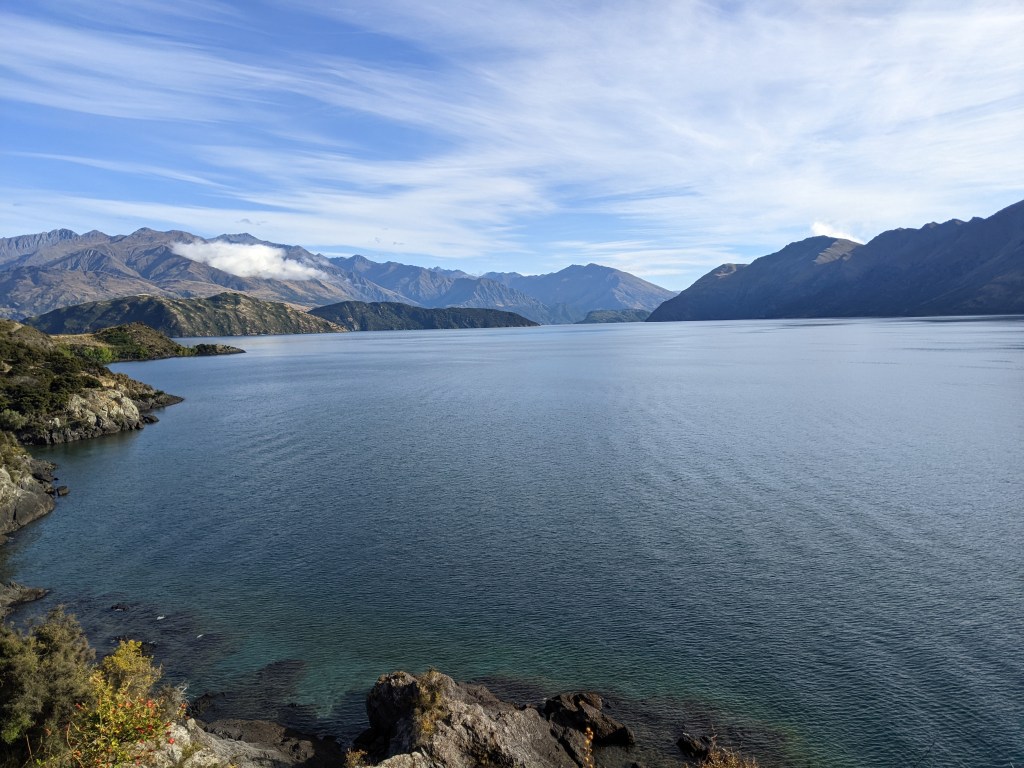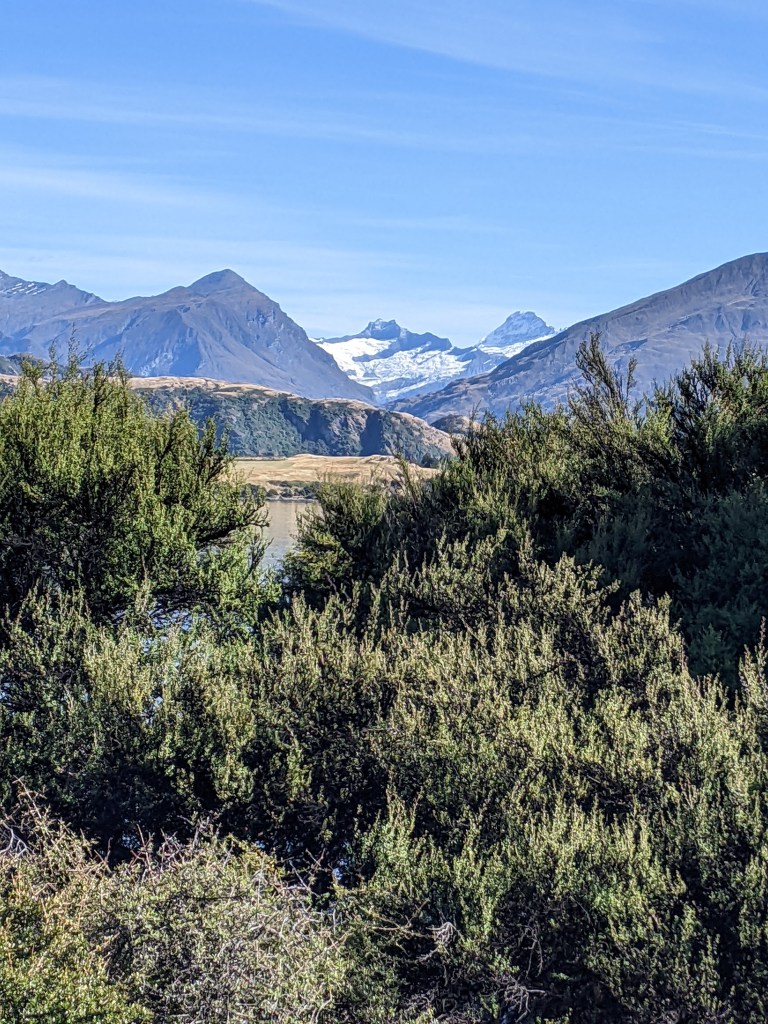 There was an information sign saying the tree is 70 years old, fragile and doesn’t grow fast. But it didn’t explain how it came to be there in the first place. We continued along the shoreline all the way to Glendhu Bay. The lake was crystal clear and was lovely with the mountains in the backdrop. We even got a peak at Mt Aspiring through a gap in the mountains.
