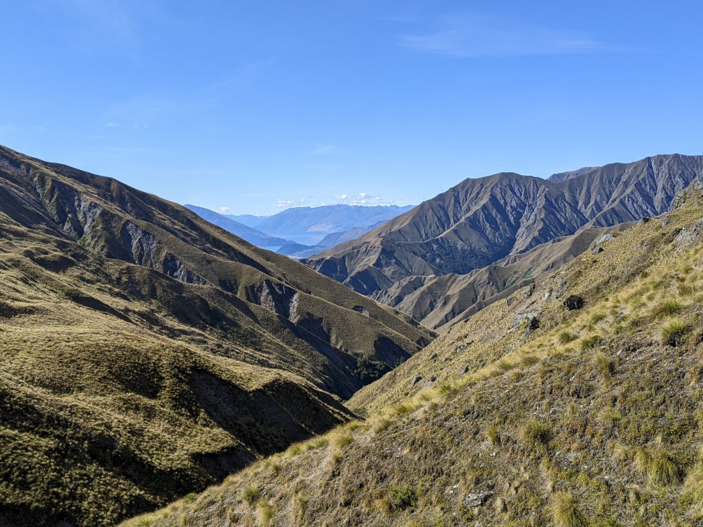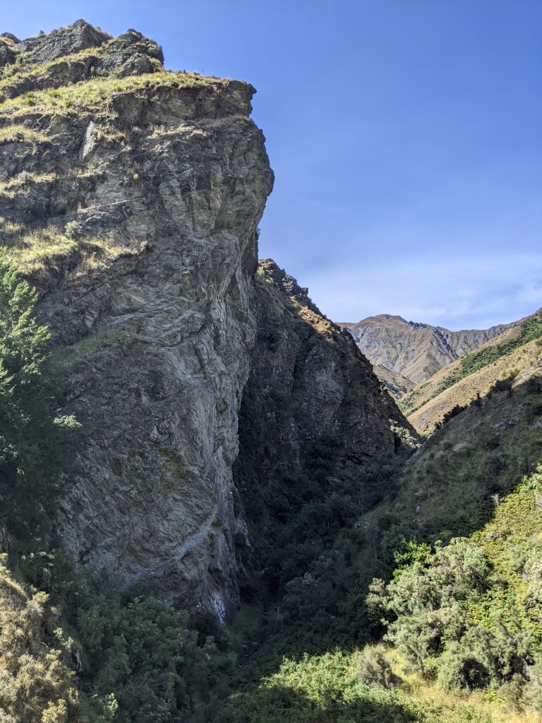 Glendhu Bay seemed to be campground and not much else but about 500m after turning off down the Motatapu road, we found a bike hire place with a cafe. We stopped in for a drink and then continued on our way. After following a gravel road for about 2 km, we arrived at the start of the Motatapu track, which we’ll follow for the next few days and which is supposedly quite hard with lots of very steep ascents and descents. It started off along the Fern Burn through farmland before entering a forest and then emerging into a tussocky landscape. There were a lot of interesting rock formations and the views were as breathtaking as any we’ve had.