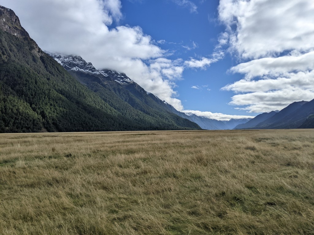 We decided to split up to hitch, but again the guy who stopped for Cécile and I also stopped for Caroline and Elsa. So we all got back on trail together. The trail starts off down a gravel road, but we didn’t get going until we’d had second breakfast given that there was a coffee cart randomly located at the junction of the highway and our gravel road. My cinnamon bun was quite lovely and my coffee much better than the one I had in town. We finally set off and the views of the snow capped mountains from the gravel road were lovely. The road wound through some farmland and we quickly arrived at the first hut where the road ends and the track begins. The track today alternates through forest and boggy tussock. The forest sections were quite lovely, especially when the sun was shining and dappled the track.
