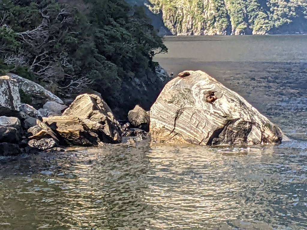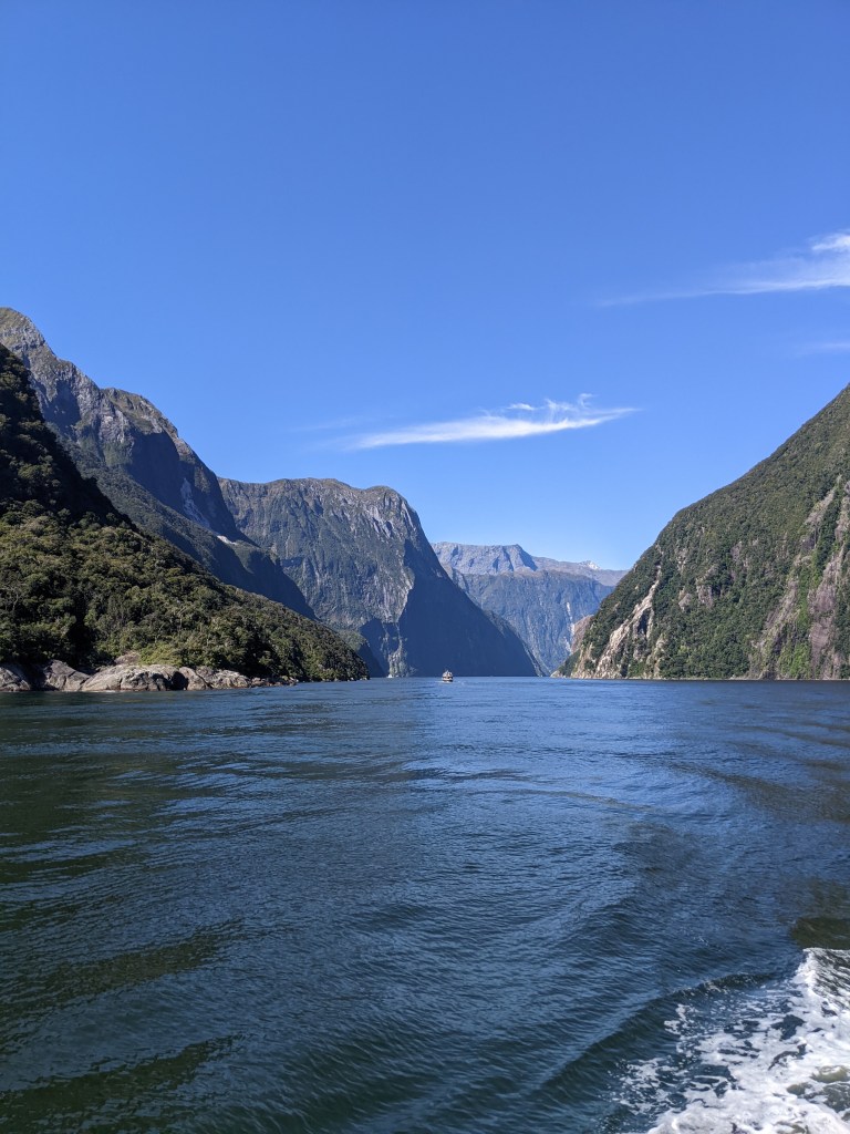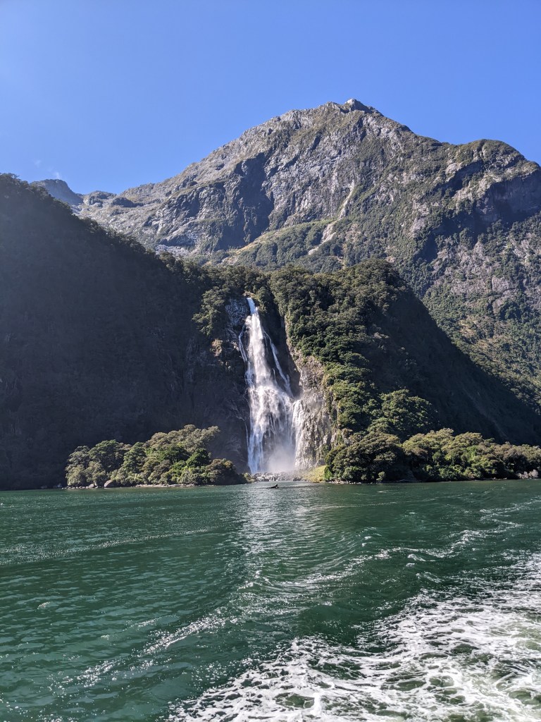 We continued on to Milford Sound through the Homer tunnel, which is just over a km long and goes under a saddle. The views were already stunning at this point, but I didn’t take any photos through the bus windows. Arriving in Milford Sound, we got onto our boat at about 1:30 and left on our cruise. We stopped at waterfalls, got misted by them, saw Mitre peak and many others, saw some dolphins and seals and overall had a lovely time out on the water.