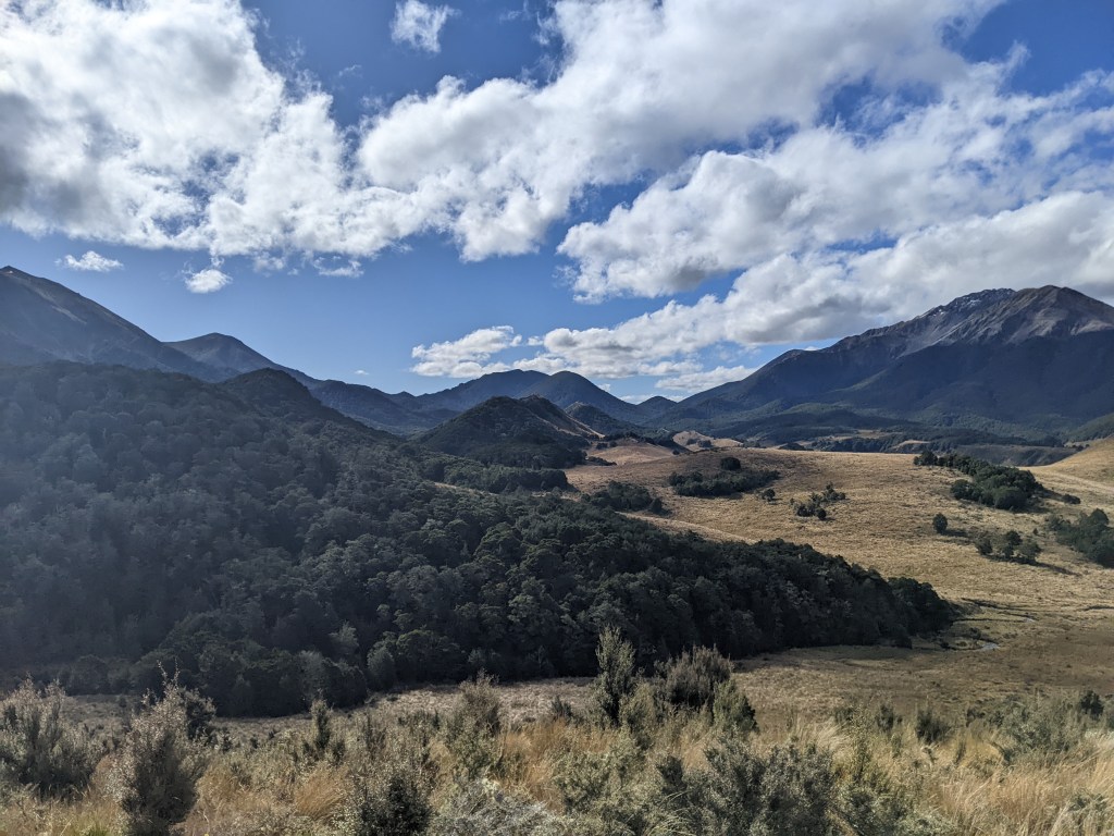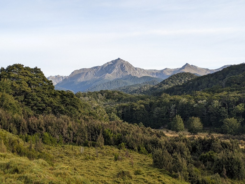 It really made finishing the trail a reality. There were also some nice views of the Takitumu mountains and we could also see Stewart Island. The climb down was through a more open and rocky landscape so it was nice to have the views for the descent. The track goes down to a campsite that’s just a toilet and some grassy spots to pitch tents. Of course the one time we have no shelter, it starts to rain, but thankfully it was only light rain. We didn’t linger outside over our dinners though and all took refuge in our tents quite early.