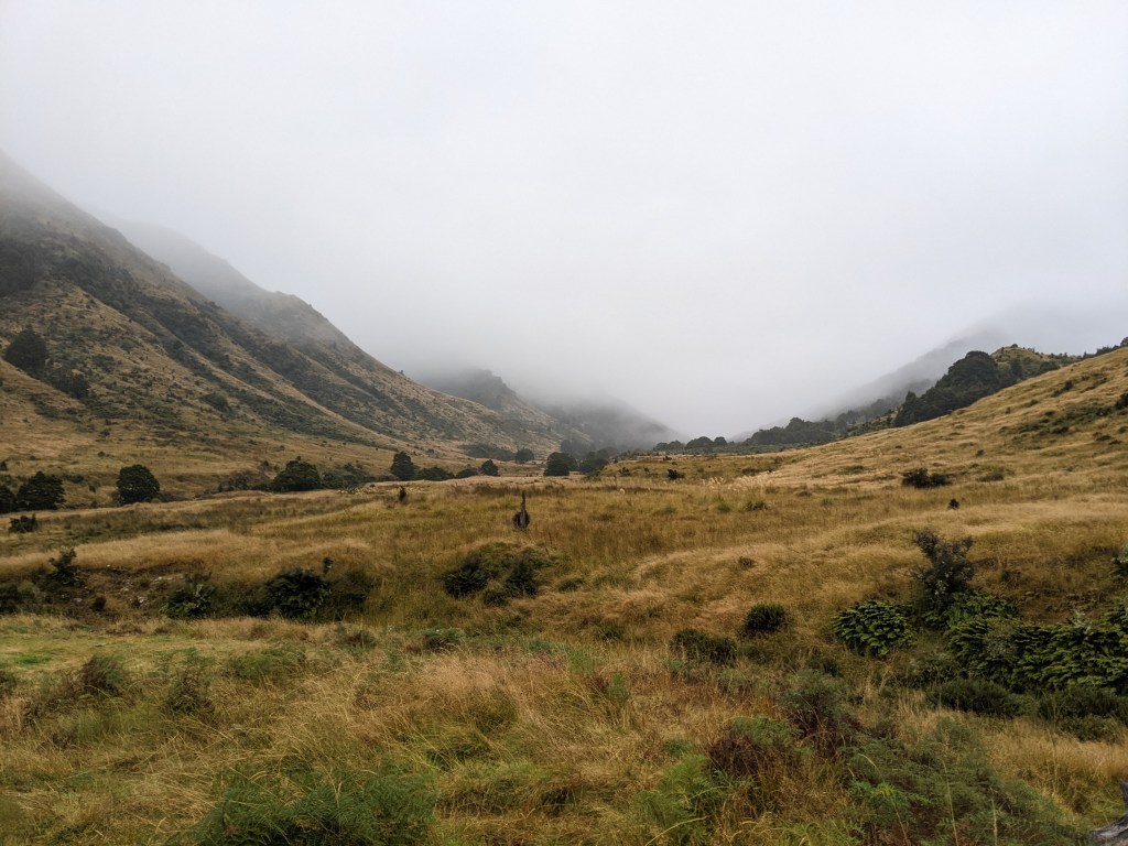 The rain became more of a mist and it was quite warm (for these days) so it didn’t take me long to take off my rain gear. The whole day was spent hiking through the largest station (aka farm) in New Zealand, called Mt Linton Station. Most of the track followed 4wd tracks, but there were some sections of hiking track. We had to cross the Wairaki river, which got about top of the thigh deep for me and was hard because you couldn’t at all see what you were stepping on and the streambed was these large rocks. We all made it across safely. There was also a section through these fields of what looked like kale, but they were huge and really soaked us.