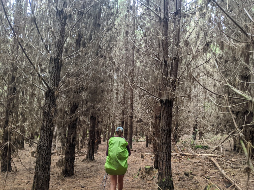 The track at the top meandered along forestry roads through pine plantations before entering real forest on a hiking track. The forest was lovely as usual and the climb down wasn’t too steep. At the bottom, we went through an eerie pine forest of seemingly dead trees before coming out at a gravel road.