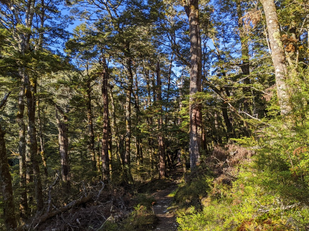 I was pleasantly surprised to find very little condensation and no ice on my tent in the morning. There was some frost on the grass in the flats, but it seemed the trees protected us. I had been plenty warm during the night, even too warm so had taken off some layers. The track quickly entered the forest again, which was lit up with morning sun and magical.