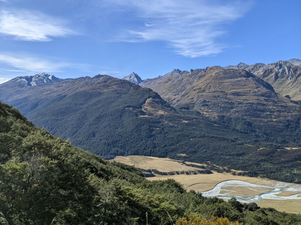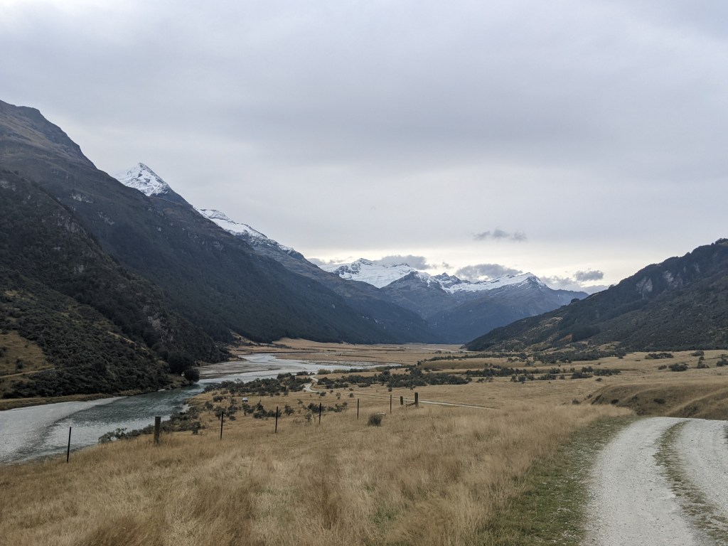 We headed down and continued to walk out of the valley. We were hoping for a ride to Glenorchy from the trail head, but saw a car way before this. It turned out to be some hunters and they weren’t going that far, only to a private hut, but they did give us a lift that far. We had another few kms to go after this lift to get to the trailhead. The views looking back down the valley were still stunning.