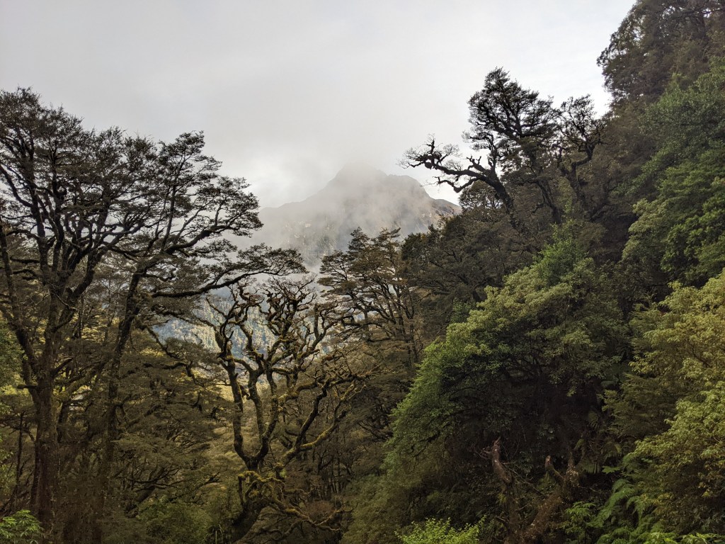 Back in Glenorchy, I decided that I would do the Routeburn before heading to Auckland. I hitched to Te Anau, spent a night there and then hitched to the trailhead at the Divide in the morning. My lift to the Divide was a guy who’d spent the summer in Antarctica working for the the Kiwi research station. I got to flip through his photos as he told me about it. Although the landscapes were amazing, my favorites were of the penguins flopping around, so cute. I started off up the track shortly before 9. It had been raining in Te Anau in the morning and there was some rain forecast, but it seemed to be clearing up and I was glad that I might actually get some views. The first part takes you up to lake Howden with some peekaboo views of the Darran mountains and a few waterfalls.