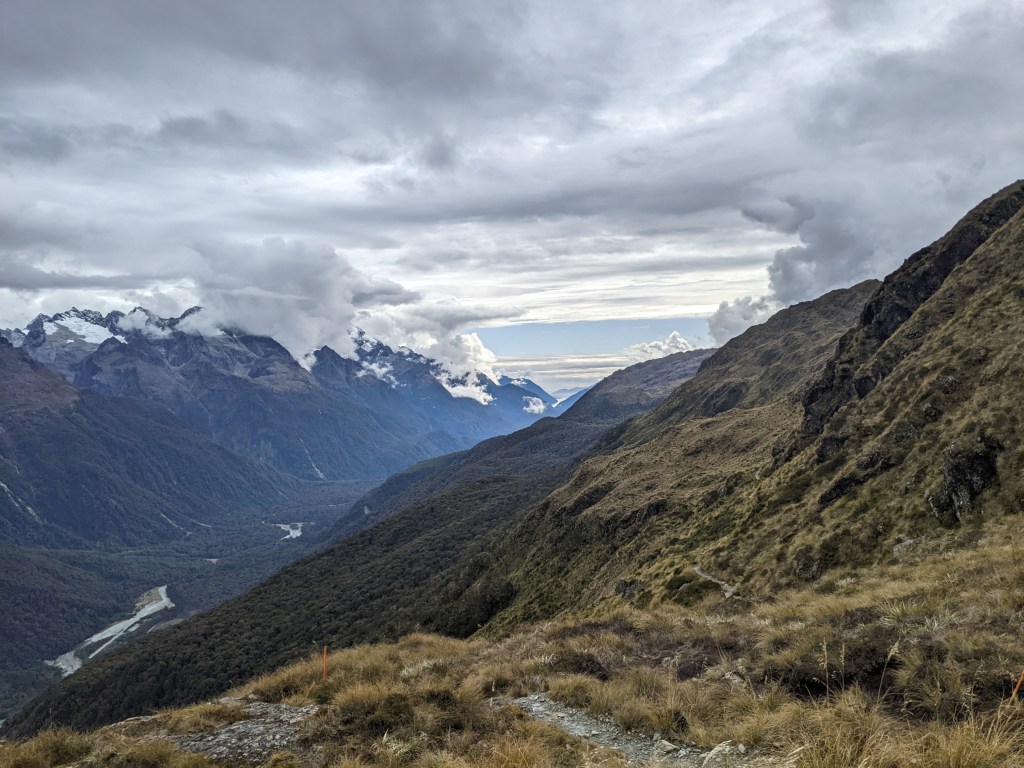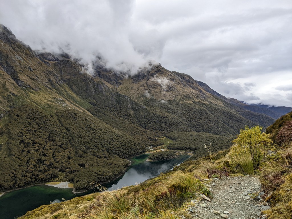 I only stopped to used the toilet (flushing) and kept going. From there the track climbed up above the lake on some switchbacks and then returned to the Hollyford valley and the Darrans.