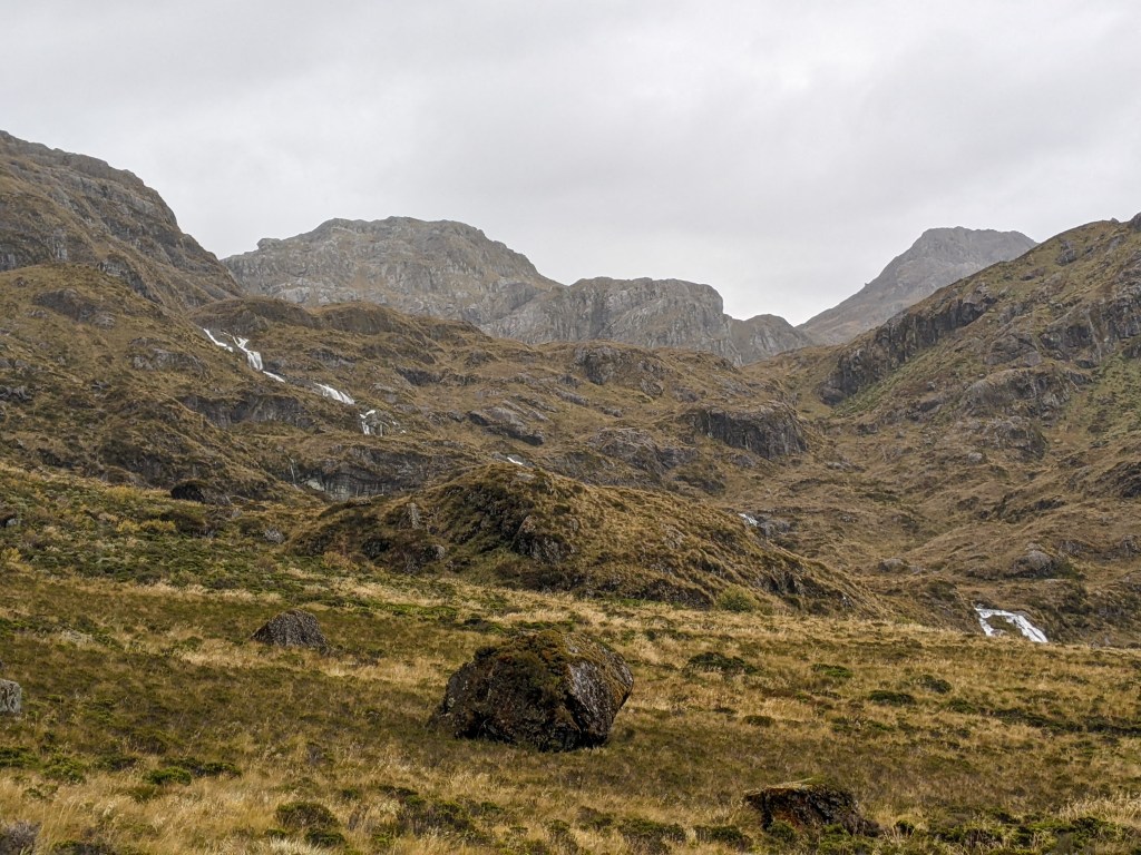 The trail staid relatively flat and open with the same views until Harris saddle, where it turned away from the Hollyford valley. The views were still stunning though with Lake Harris coming into view surrounded by peaks.