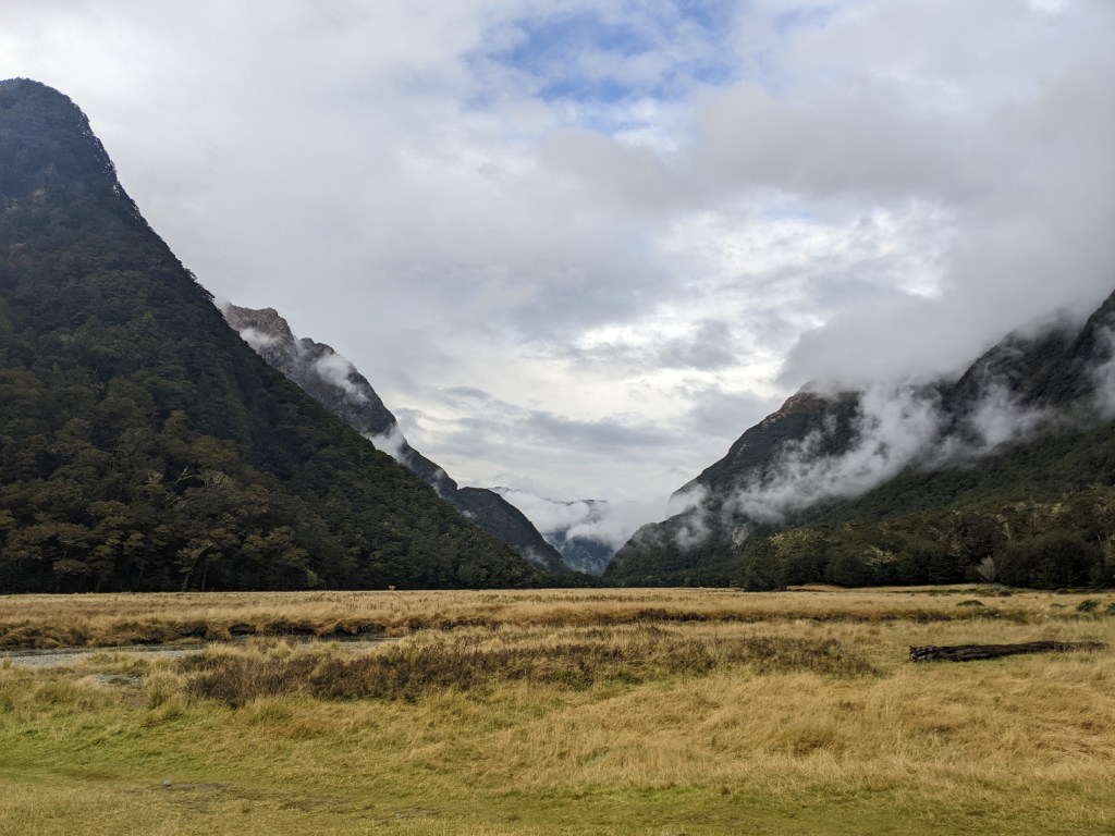 The hut looked massive and was busy. I kept going after a very short break and enjoyed a lull in the rain as I walked down the mountainside to the Routeburn flats hut and campsite. I’m tenting tonight since there were no hit spaces available, but that’s probably a good thing given the hut is packed. The campsite faces the flats with views to the Humboldt mountains, including a peak in the foreground that’s the iconic image associated with the Routeburn.