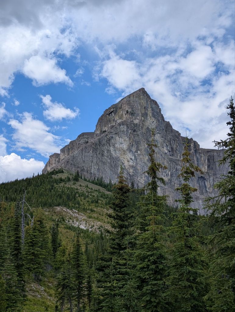 After a bit of downhill, I refilled my water at the creek and then climbed again. It started to get a bit cloudy and all of a sudden I ran into a man setting up his tent off trail. He said he was afraid it would storm and a few rain drops did indeed start to fall. I continued on since previous showers had been brief, but did stop to shelter under some trees when it began to hail a bit. It stopped after 10 minutes, so I continued on but after a while some more ominous clouds appeared. Just as I got to a campsite, it started to thunder and rain so I set up the tent and took shelter. The thunder really echoes around the mountains but didn’t seem to be coming from too close. All of a sudden, I saw a flash of light and heard the deafening thunder not even a second later. That got my attention and I was feeling a bit nervous since it had been so close, but thankfully the storm started to abate and move further off. After waiting a while after the last thunder, I emerged and packed up to continue on since I really wanted to get to the next campsite to set myself up for a climbing La Coulotte as early as possible tomorrow.
