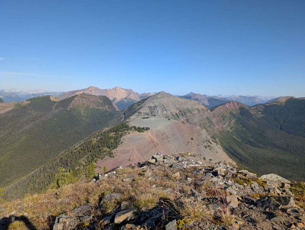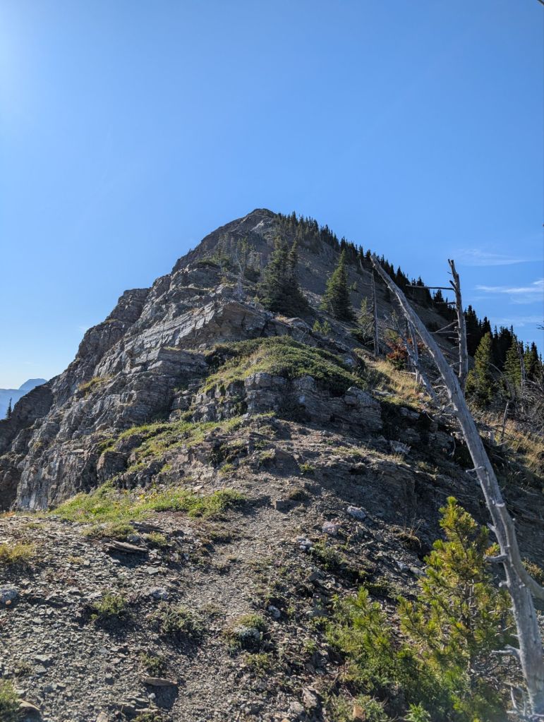 As opposed magic of yesterday’s ridge, this one was tricky to navigate with some scrambles. The trail was also hard to find in places, a theme of the day. I ended up going down from the summit on the sketchiest slope, half crouching in slippy rocks above a steep slope. I eventually found the real trail that wasn’t that much better. After another tricky bump to get up and down, it was the main event, Coulotte peak.
