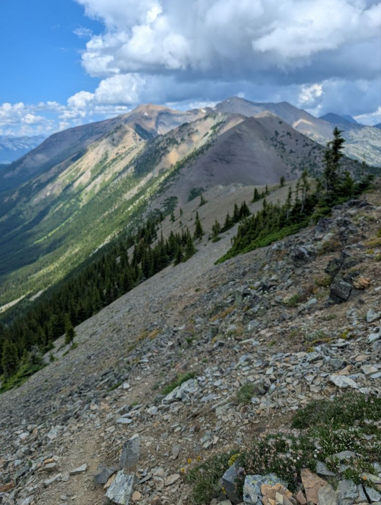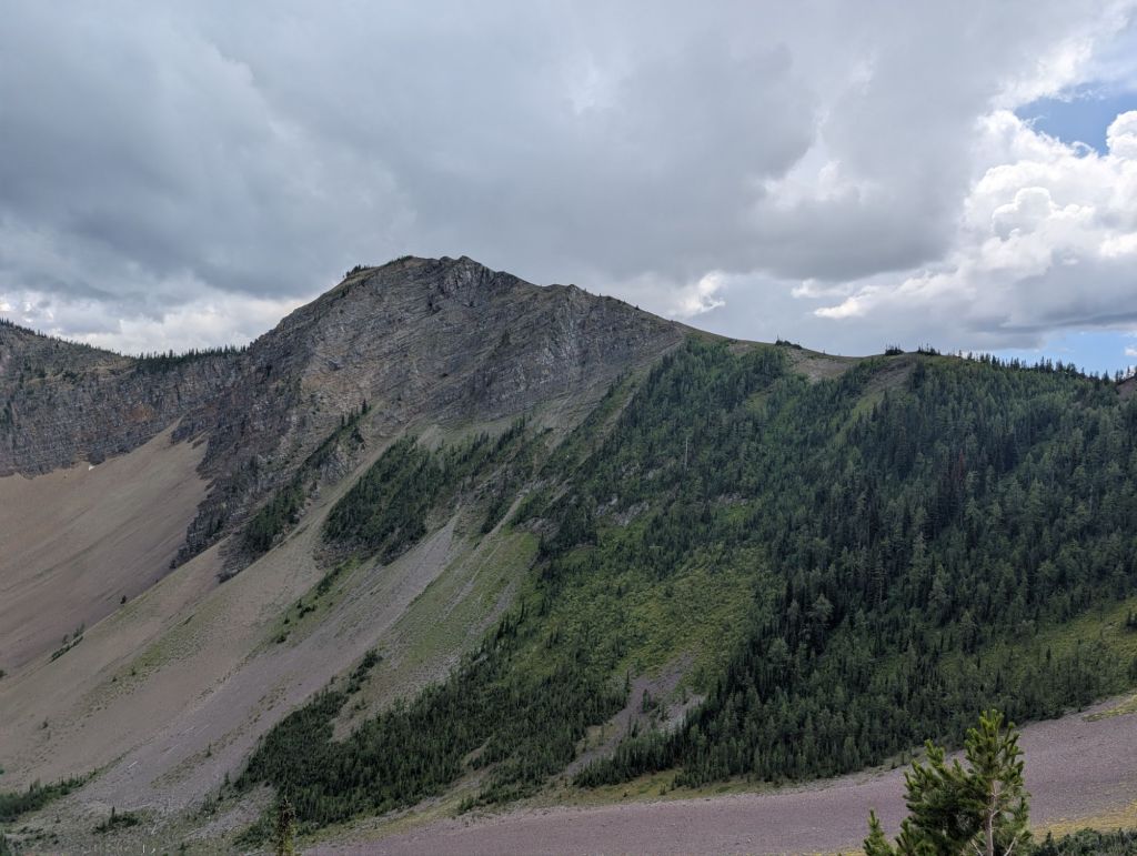 I finally got off the ridge and down into some trees when the skies opened with rain and hail, the lightening and thunder followed shortly. It was longer and more intense than yesterday’s storm and I didn’t have anywhere to pitch a tent so I just sheltered under my fly. I got uncomfortable eventually so just stood in the trees for a while. I waited for the worst to be past and got moving again since I was getting cold. It was down this old forest road/ATV track, steeply, on and on. It was rocky and wet, but not slippery thankfully and eventually the trail flattened out. I had to cross a few streams that had swollen with the rain. They were fine, but the water was definitely flowing. I also glimpsed the summit I had been on earlier, covered in white. Everything was soaked and the trail was overgrown in places so even once the rain stopped, I still got drenched. I eventually got to a bridge and since the sun had come out, I decided to rest a bit and dry my tent fly and rain gear. It was then that I realized that my pack liner has a big gash in it. I luckily have all my stuff in waterproof stuff sacks inside the liner, so nothing was wet. I don’t like that one of my waterproof layers is ineffective now but I can pick something up at the next town in a few days I dare say. After the drying session, I continued on and made it into a place called Castle Mountain. There’s supposed to be a campground, but it seems to be all RVs and no one around to ask since the kiosk closed at 4 pm and it’s 7 pm. I just set up in some trees and had dinner by the river before cleaning up and calling it a night. As I write this in my tent, it sounds like another couple arrived and are setting up nearby , which makes me feel that it should be ok.