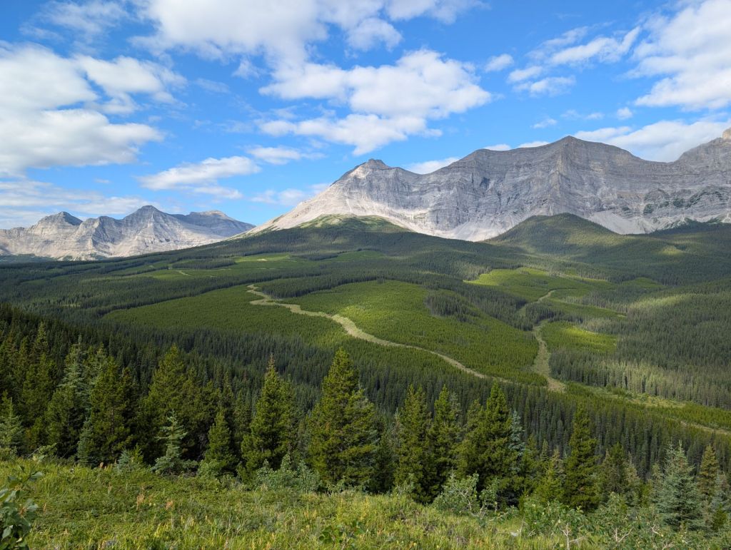 It didn’t take too long to do the 6 km to Etherington Creek road, my planned exit point from the trail. It wasn’t really a road, more a boggy clearing with muddy wet cattle trodden holes everywhere. It did improve in places, but was also flooded in others. You could see where others had gone to get around the flooded bits so it was easy enough to navigate. Luke was with me since he decided to also exit here and share my ride to Peter Lougheed provincial park. We got to the junction with the road at around 1 pm and ate lunch while waiting for our ride at 2 pm. Chantel showed up right on time.