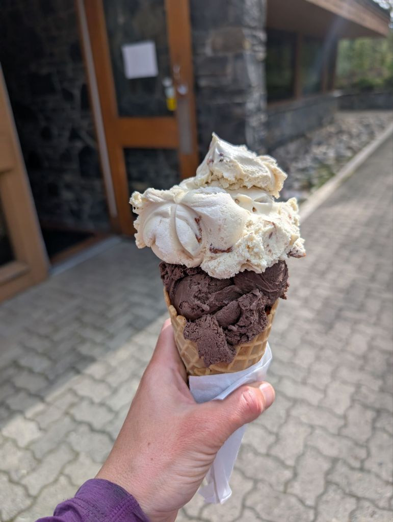 Chantel drove us to the food lockers where both Luke and I had food packages waiting. However, mine wasn’t in the locker it was supposed to be in. There was a number posted to text if any issue although there was no cell service to do so. I figured, I could contact them from the Boulton campground, where I have a tent site booked for the next 2 nights and where there is Wi-Fi. It turned out that there was some confusion with the locker numbers and that my parcel was there, just in another locker. With the codes to all the lockers, I headed back to the food lockers 2.6 km up the road. Luckily I got a hitch most of the way there and all the way back and was able to find my parcel. Back at Bolton, we decided to get an ice cream, since everyone around was having them. There was a line up and when it was finally our turn, the guy at the window said they were closing up since they were selling out and didn’t seem to want to serve us. Someone else then said that they would serve those in line but no more, phew. I ordered 2 scoops, butter pecan and chocolate, and was handed the most ginormous ice cream I’ve ever seen. Maybe he felt bad when he saw my face when he said that that they were closing up. Anyhow, it was a ridiculous amount of ice cream and I didn’t even try to eat it all.